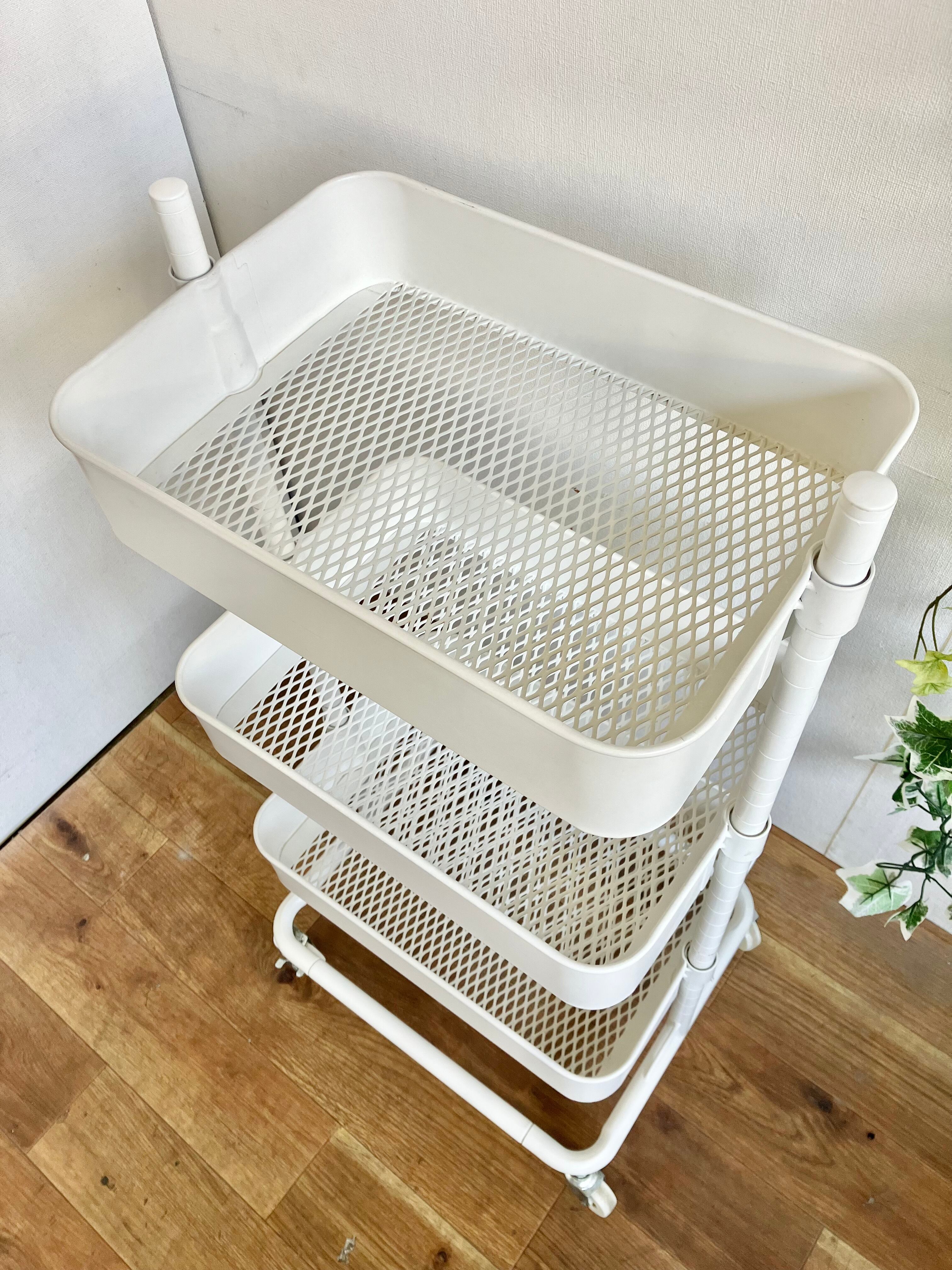 キャスター付きで3段のカゴで収納分けできるキッチンワゴンです。
