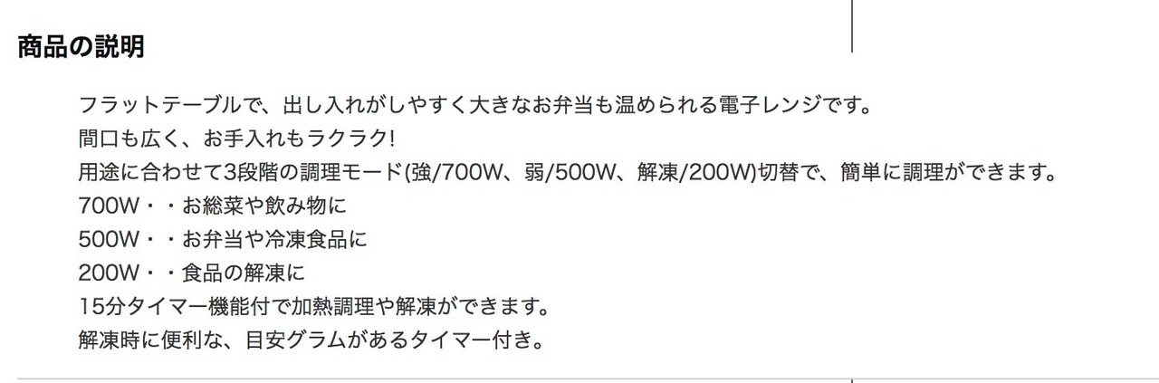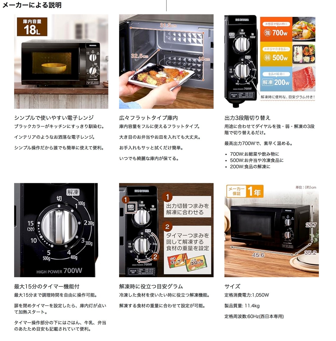 シンプル操作で使いやすく、出力3段階切替(200W/500W/700W)対応で、温めから解凍まで幅広く活躍。
