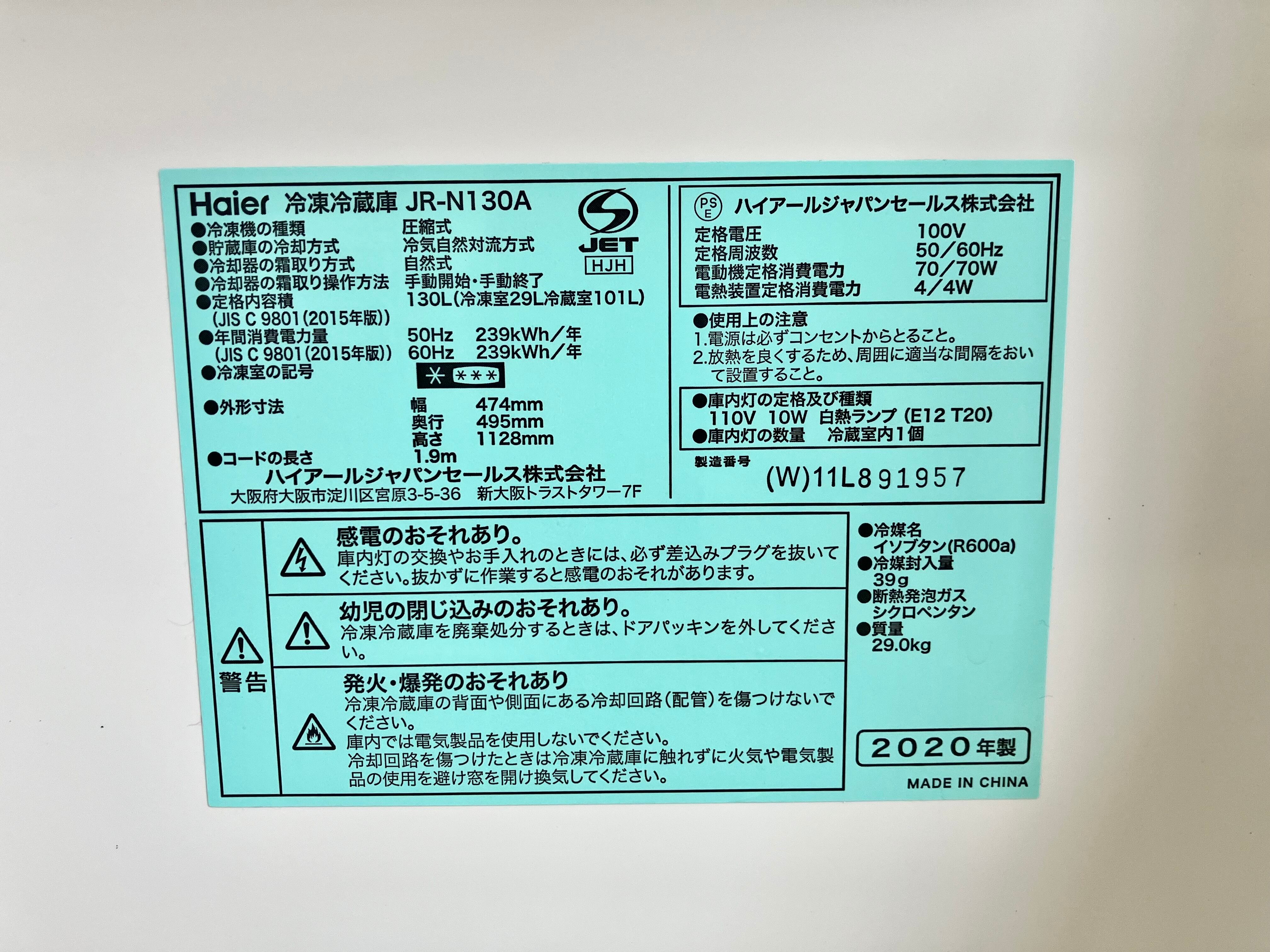2020年製 Haier 130L ノンフロン冷凍冷蔵庫