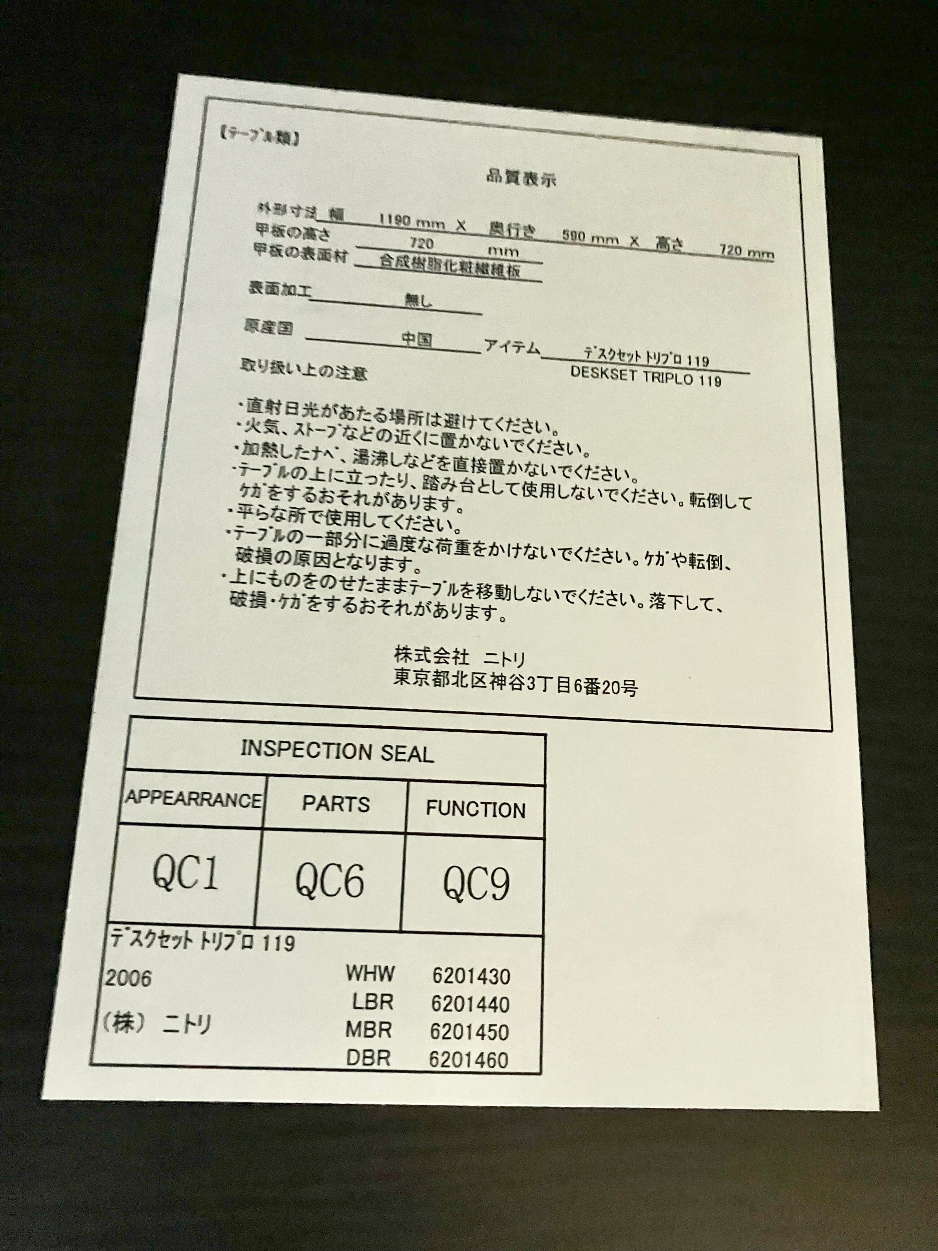 ニトリのデスクセット「トリプロ119」とリクライニングワークチェア「フォリスト」の4点セットです。