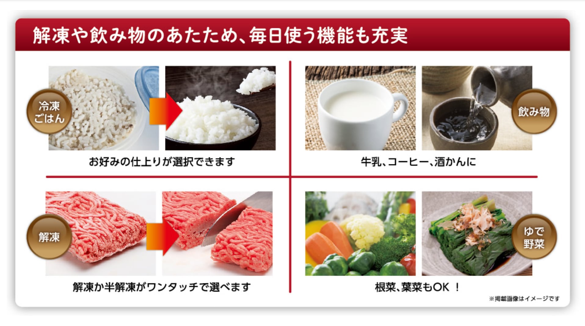 解凍機能も搭載しているため、冷凍食品やお肉の解凍もスムーズ。