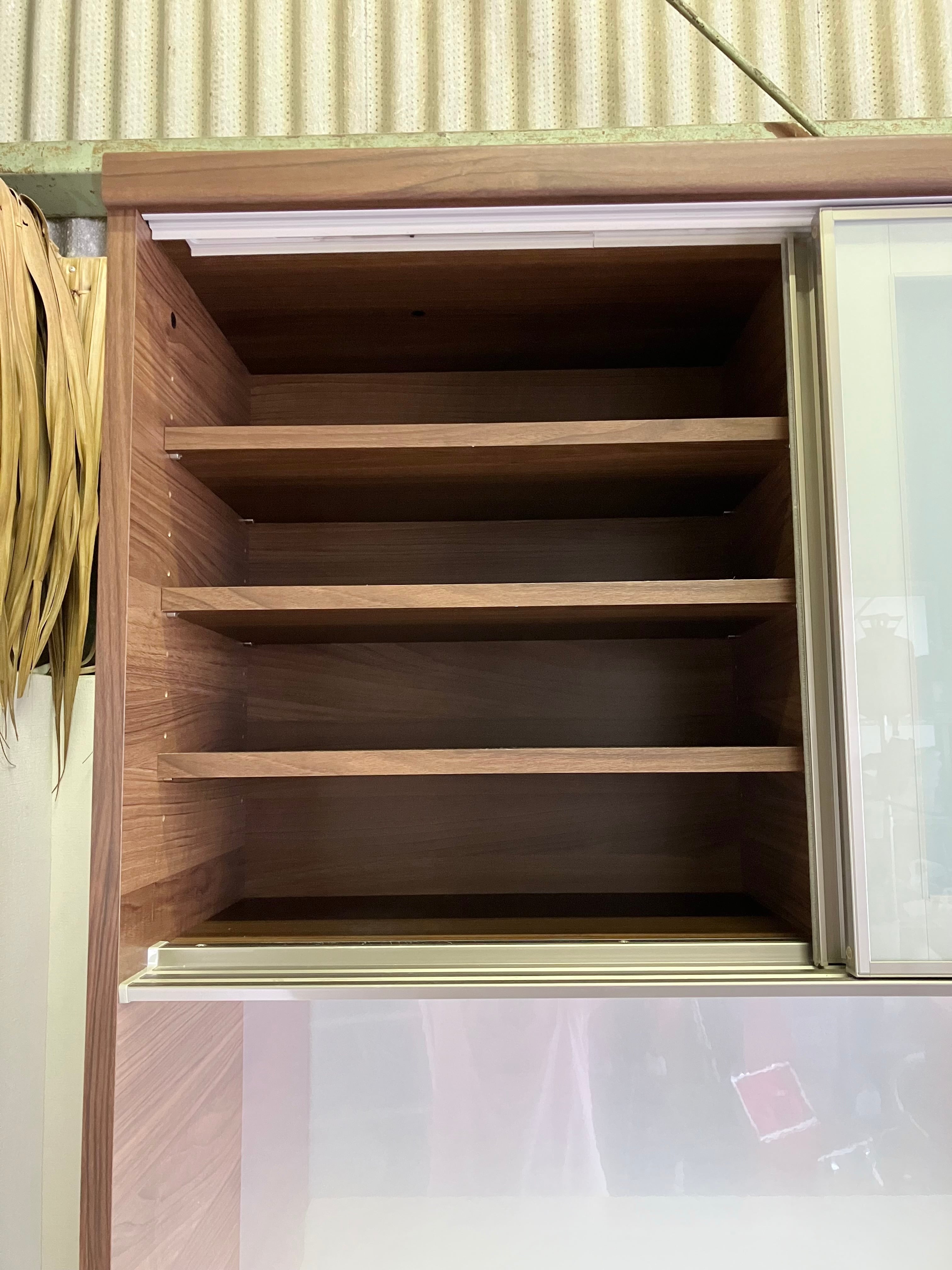 天然木の落ち着いた色合いとホワイトカラーのコントラストが魅力的な、ナチュラルで清潔感のあるキッチンボードです。