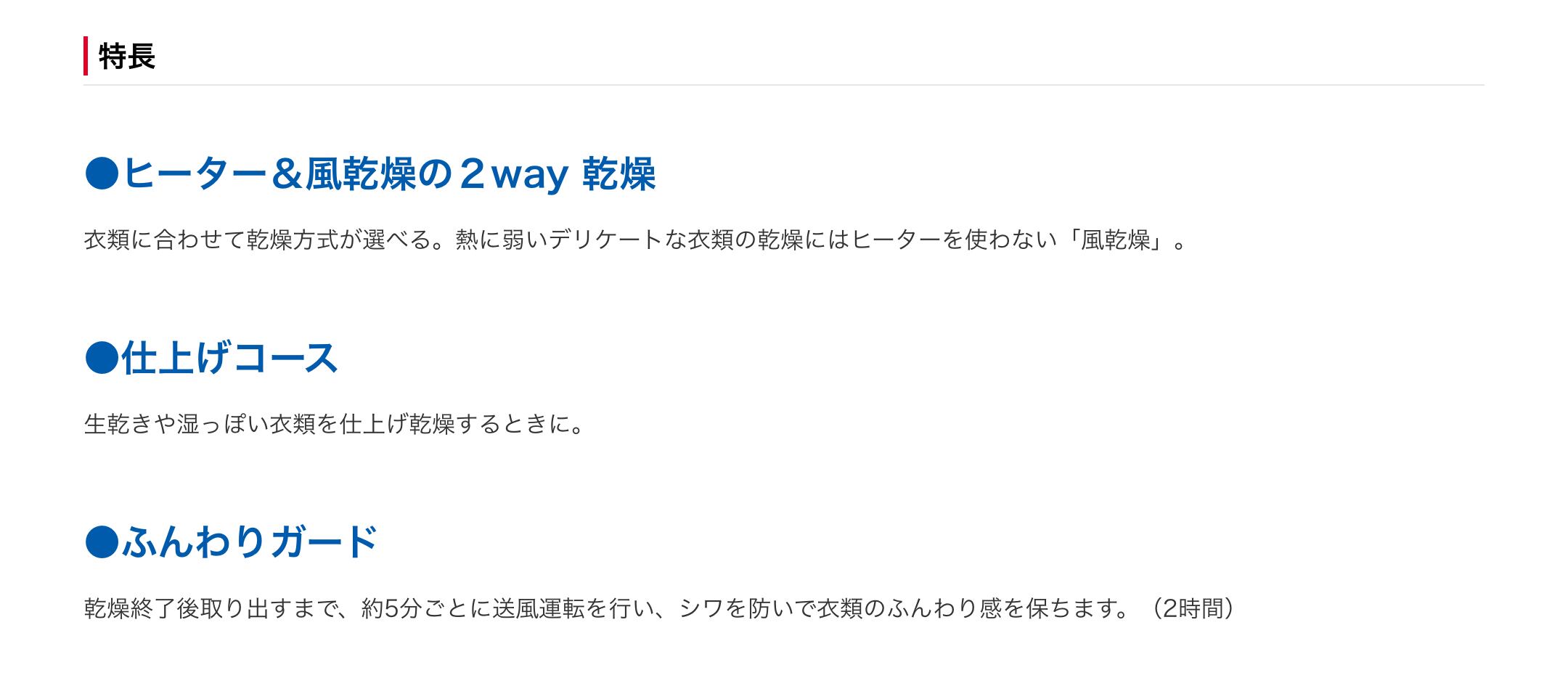 • 生乾きや湿り気のある衣類に対し、仕上げに最適な乾燥が可能。