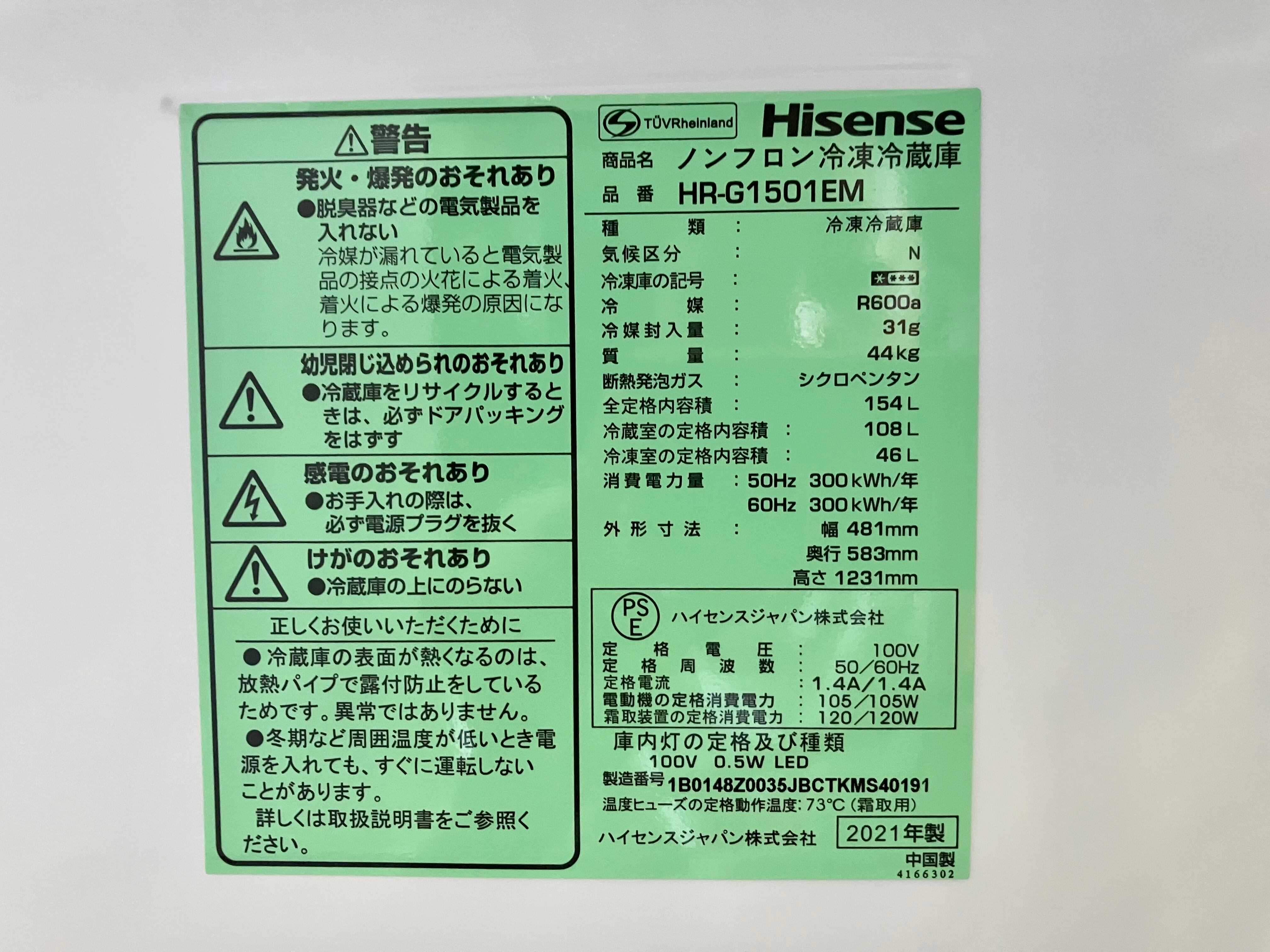 2021年製 Hisense 154L ノンフロン冷凍冷蔵庫