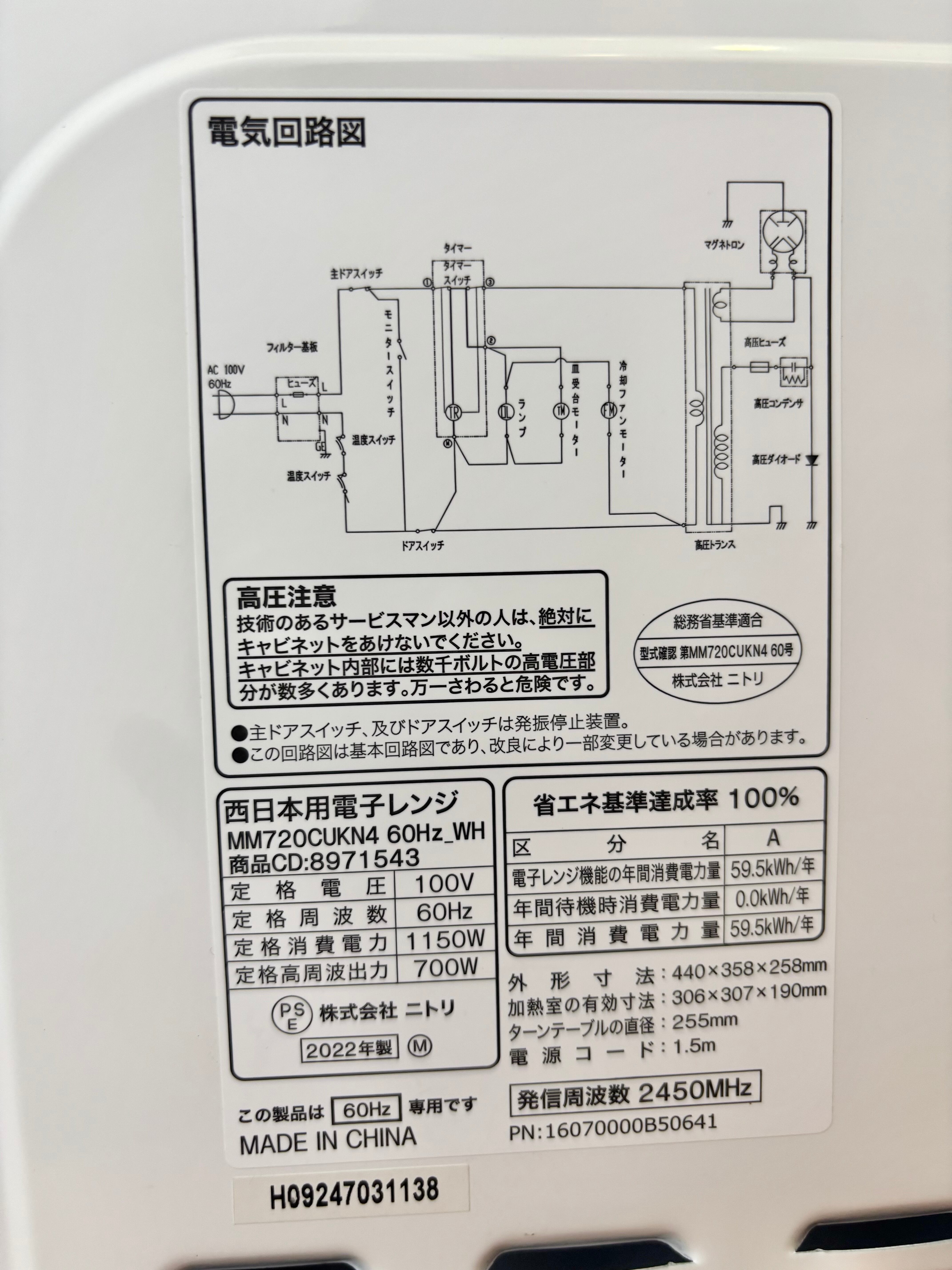 2022年製 ニトリ 電子レンジ 60Hz専用