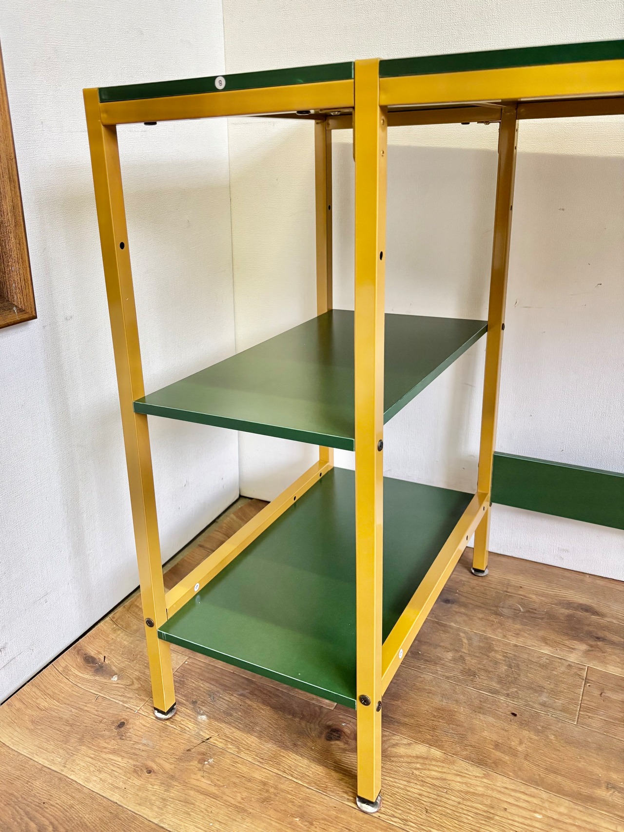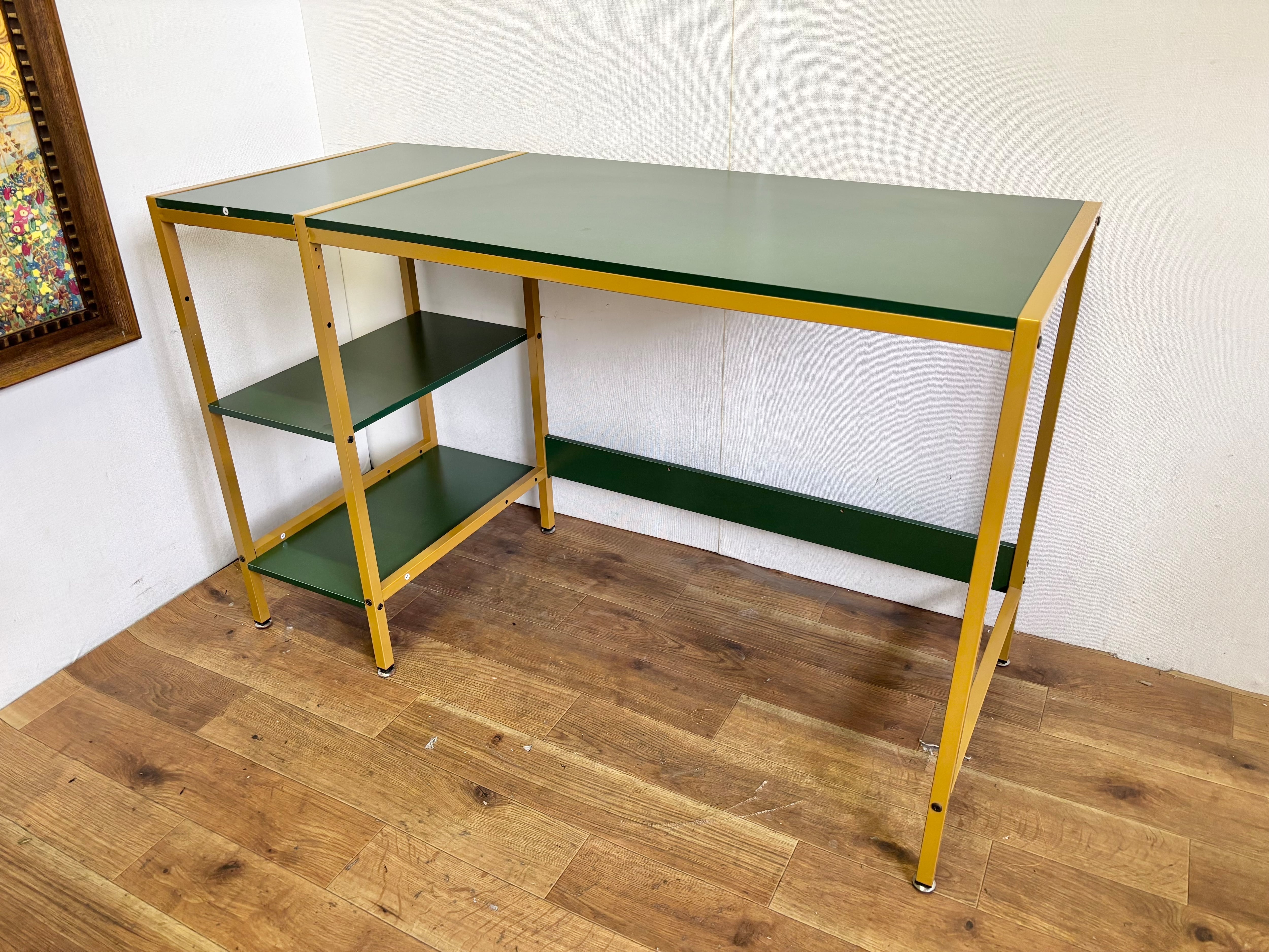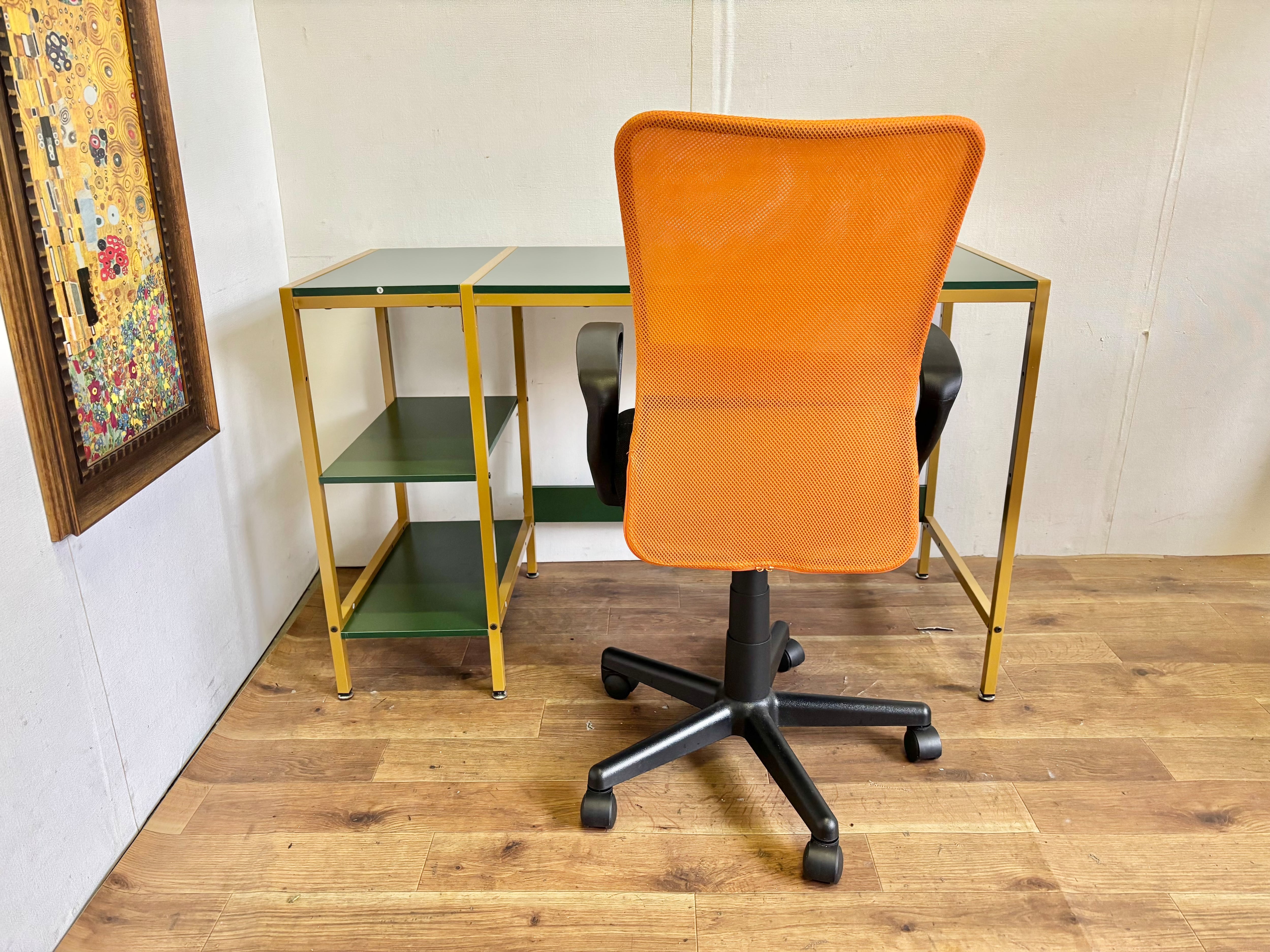 おしゃれなグリーンカラーのデスクと昇降機能付きデスクチェアの2点セットです。