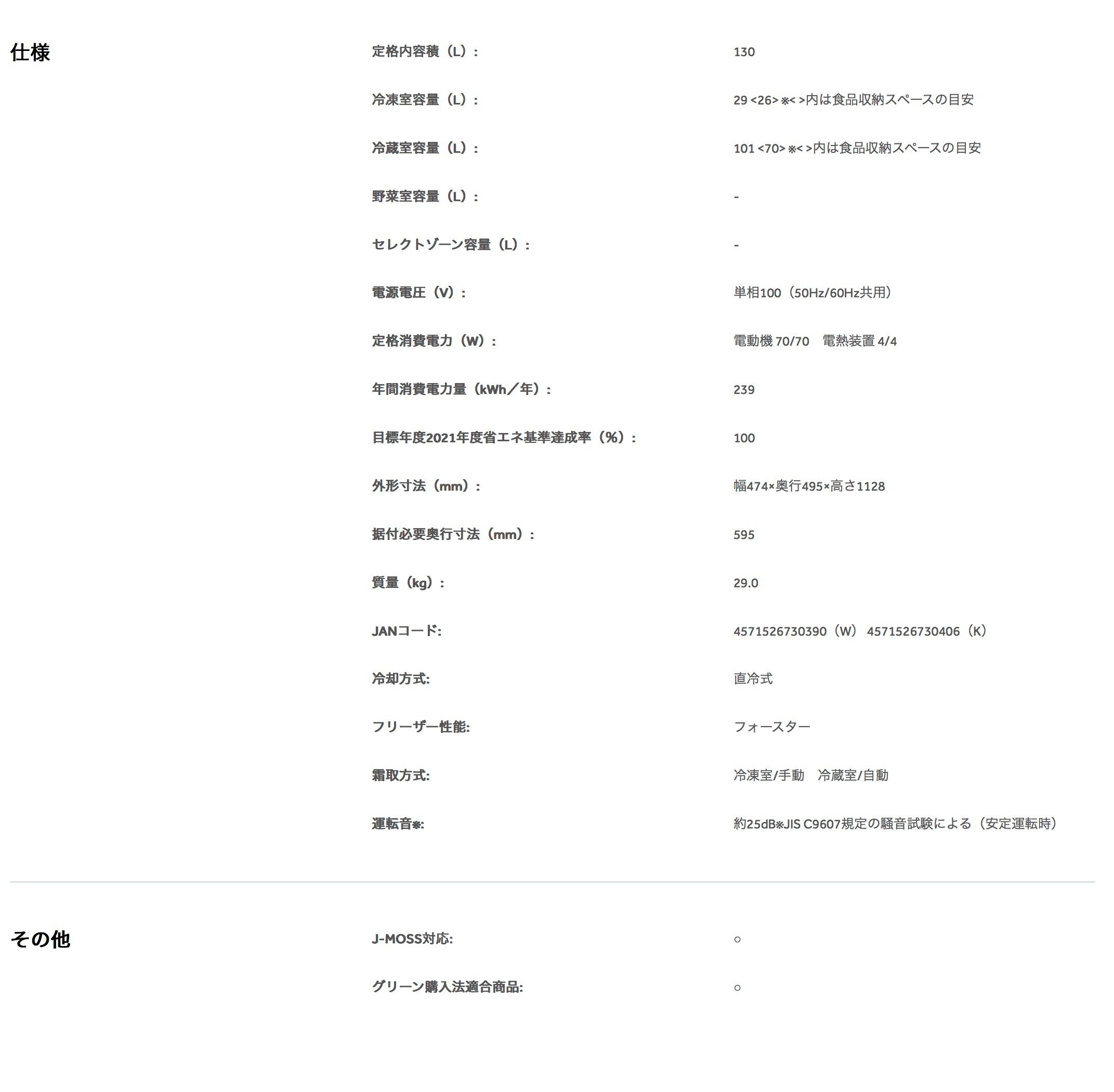コンパクトながら使いやすい130Lサイズの2ドア冷凍冷蔵庫。