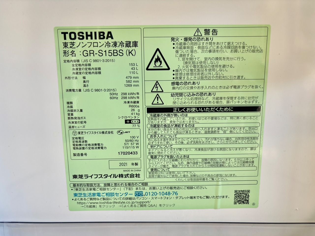 2021年製 TOSHIBA 153L ノンフロン冷凍冷蔵庫