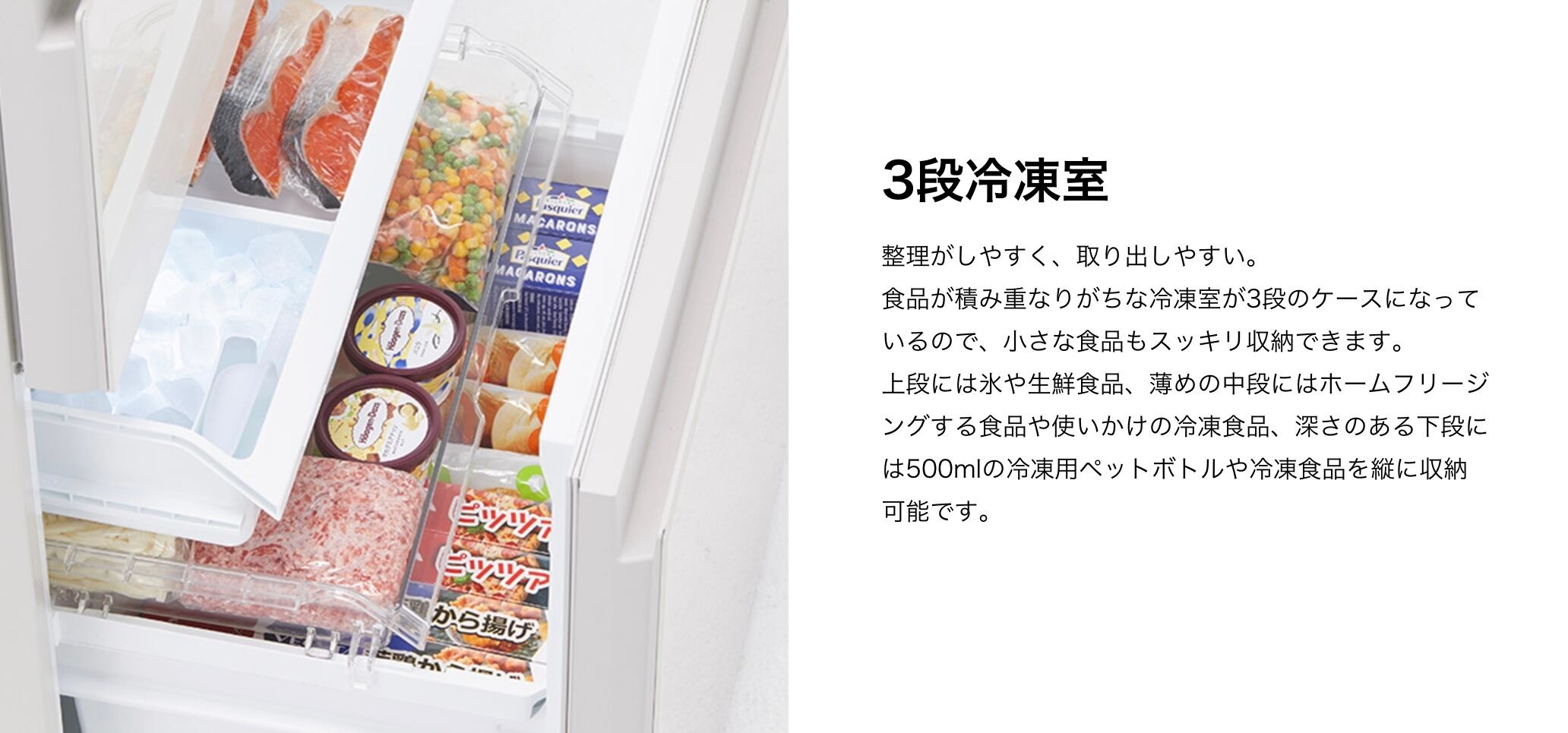 小さい食材をスッキリ整理しやすい大容量の3段冷凍室。上・中・下段に分類わけして収納できるから、食材が見つけやすくラクに出し入れできます。
