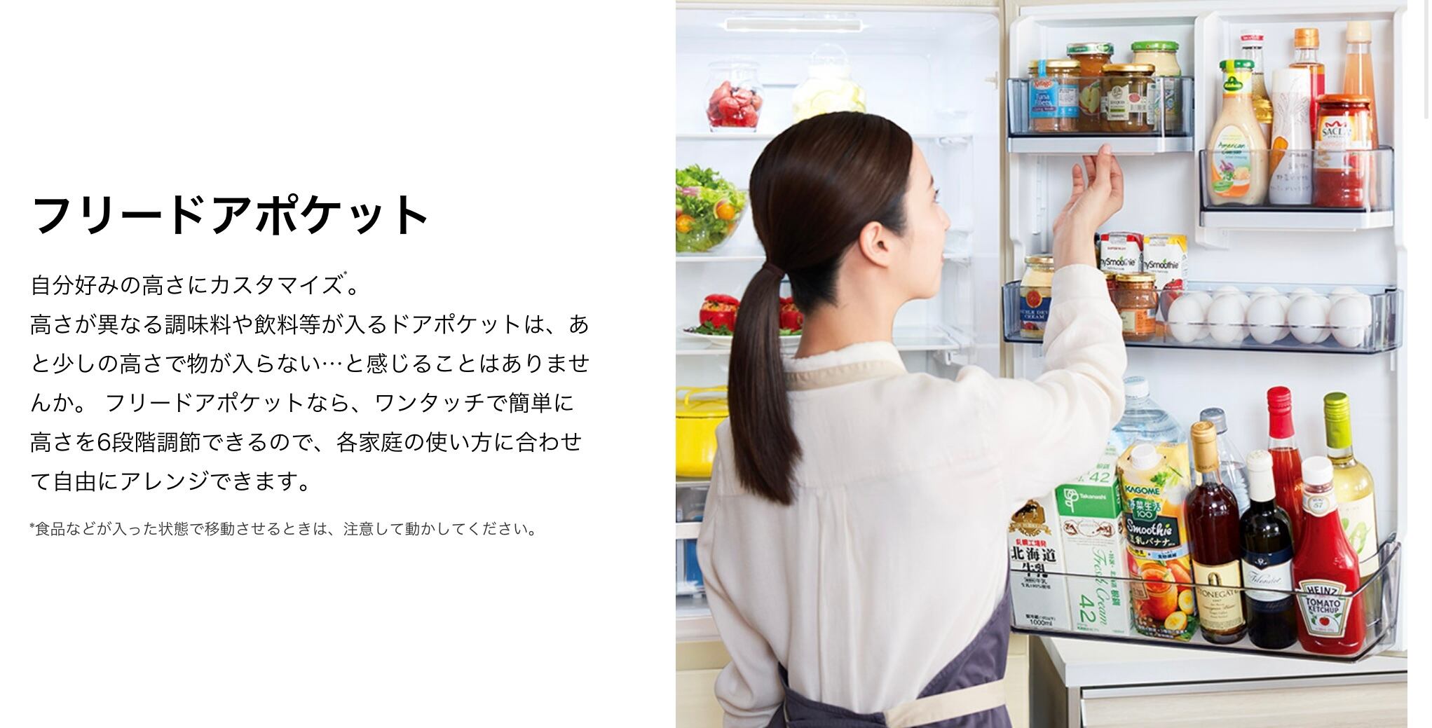 入れるもののサイズに合わせて高さを変えられるから、背が高い物をしっかり収納。小瓶やチューブもスッキリ収納し、スペースを無駄なく使うことができます。ドアポケット位置のバリエーションは、72通り。
