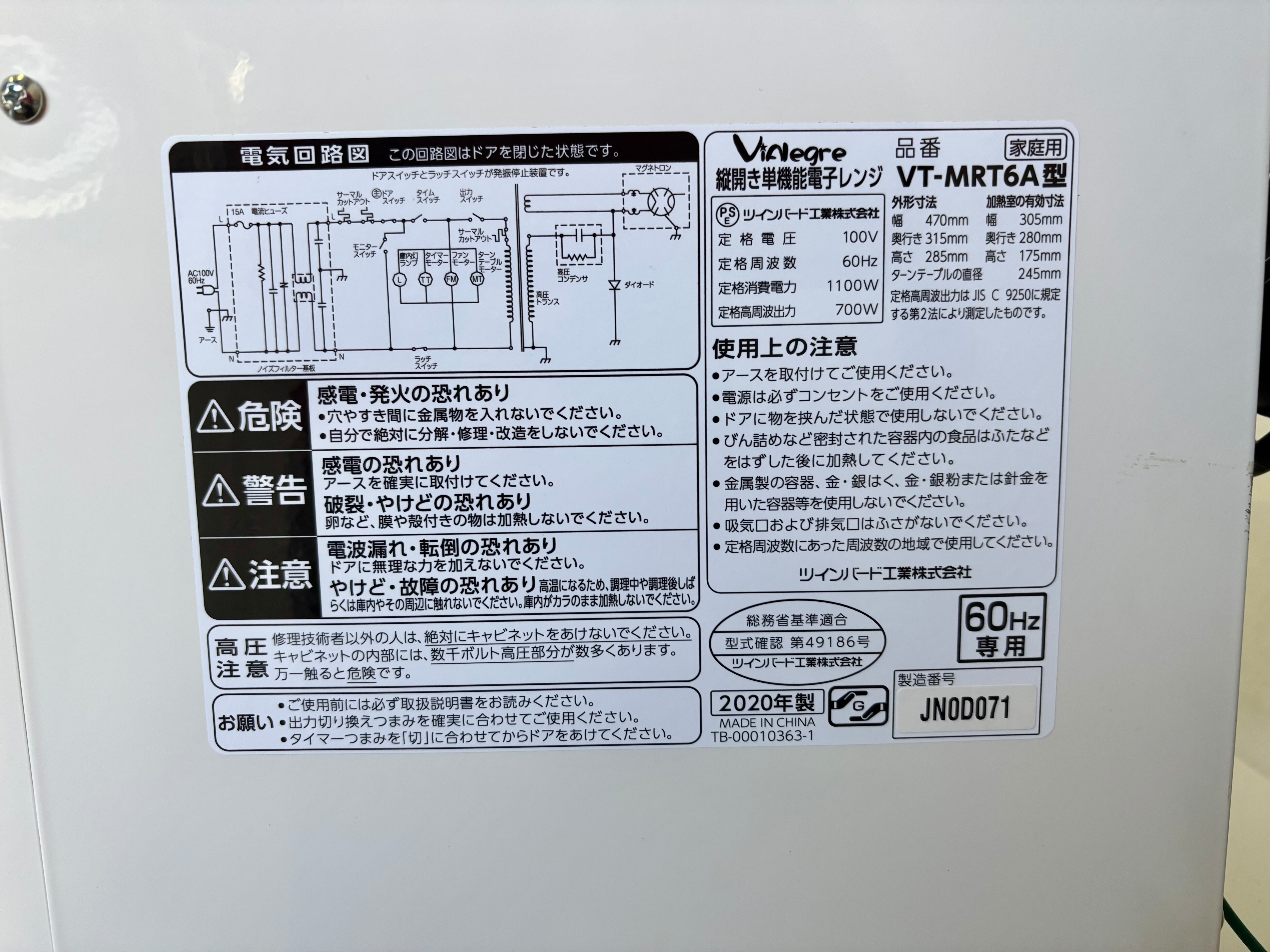TWINBIRD 電子レンジ 60Hz専用 2020年製