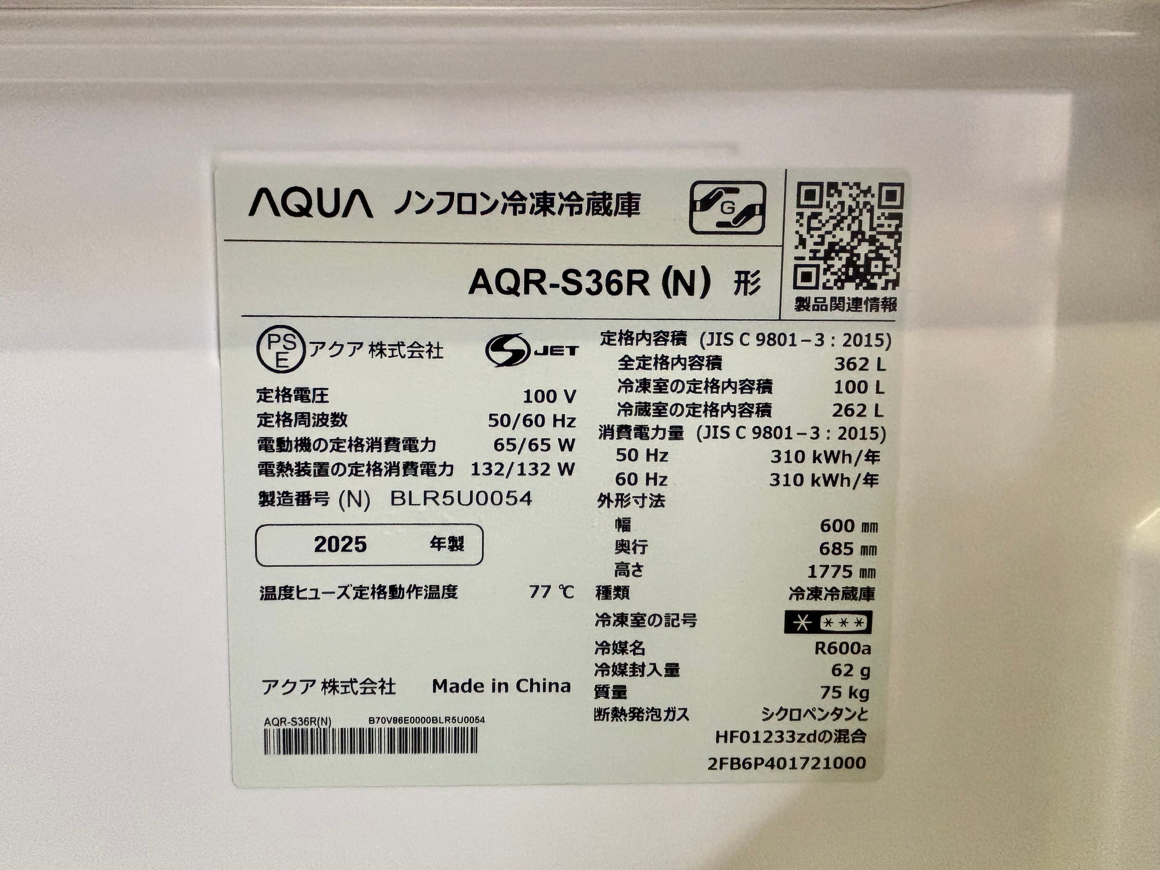 2025年製 AQUA 362L ノンフロン冷凍冷蔵庫