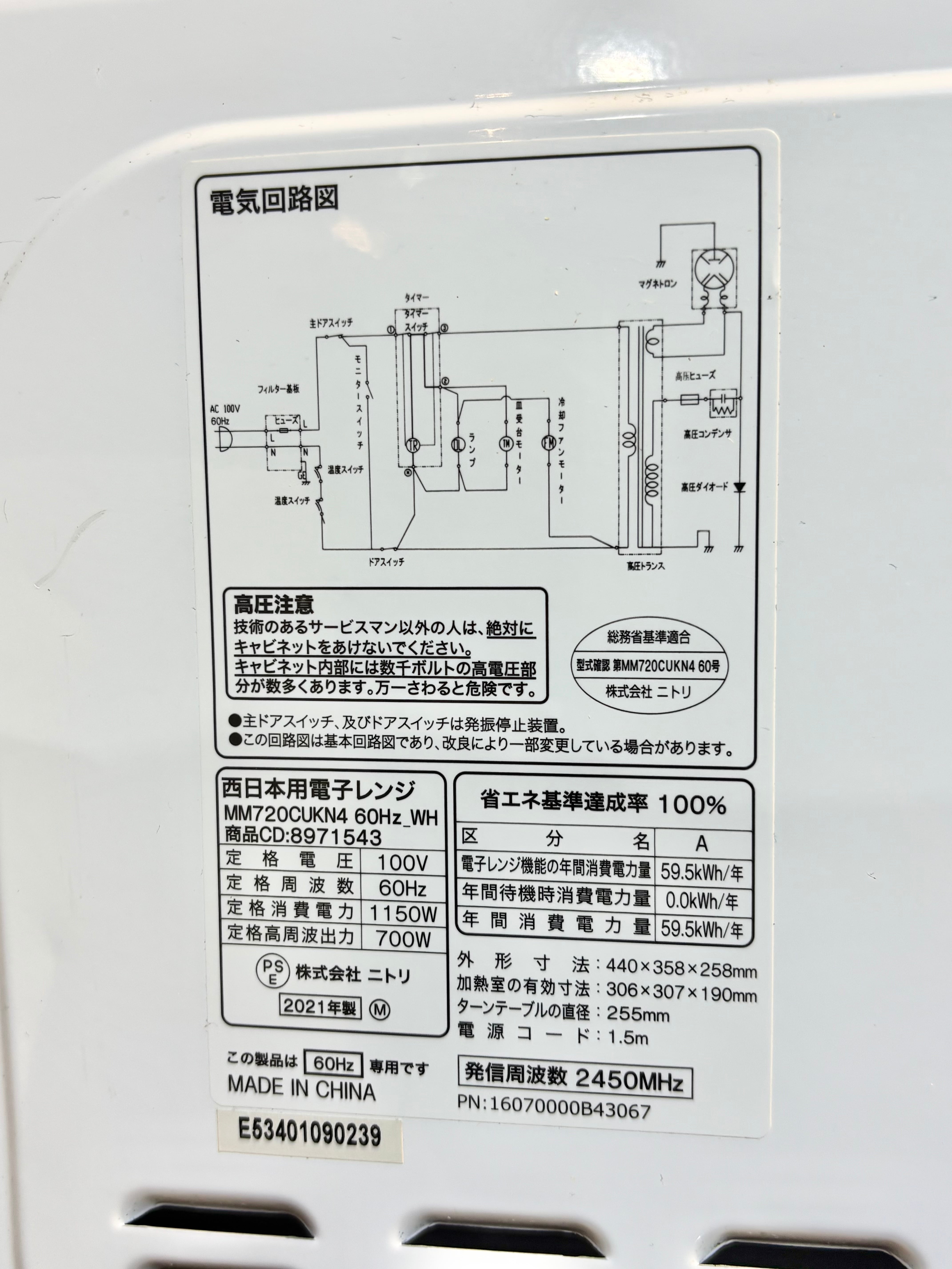 シンプル操作の60Hz専用(愛知含む西日本で使用できます)電子レンジです。
