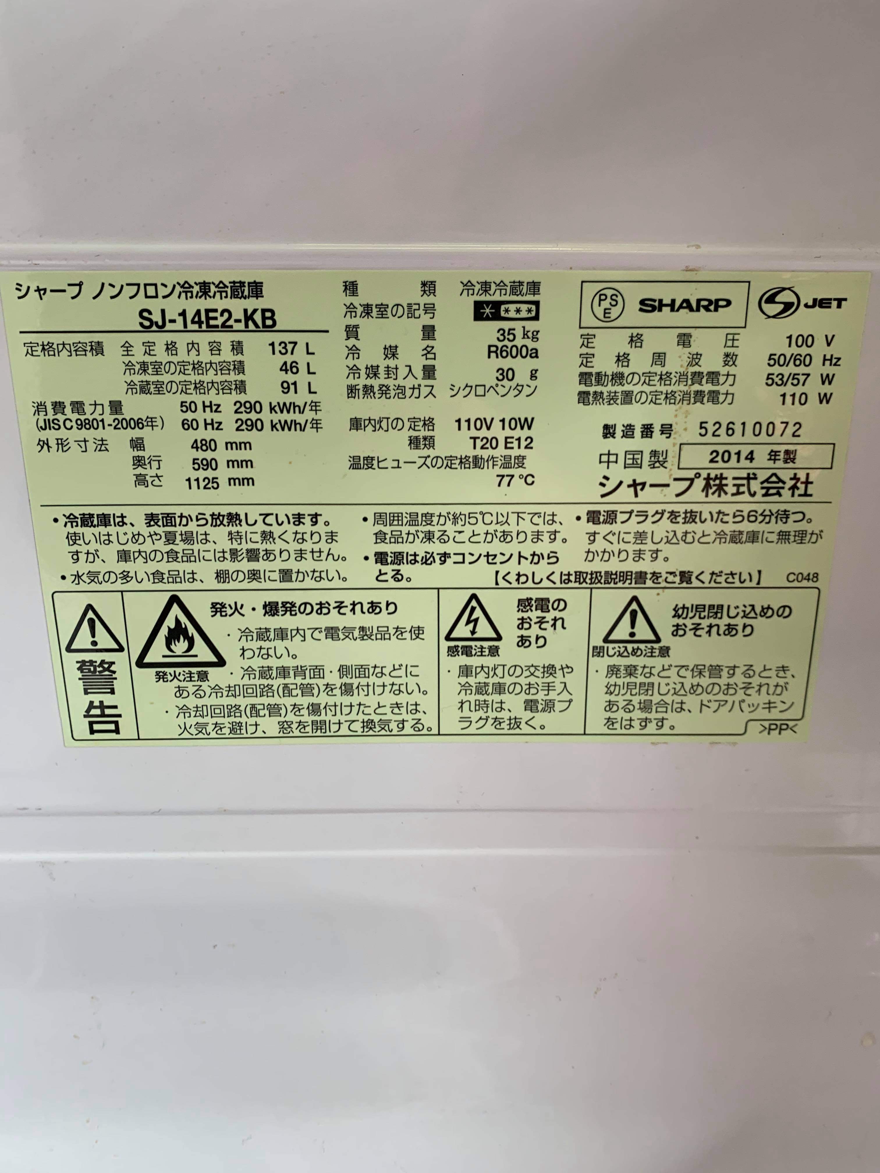 SHARP ノンフロン冷凍冷蔵庫 137L 2014年 SJ-14E2-KB