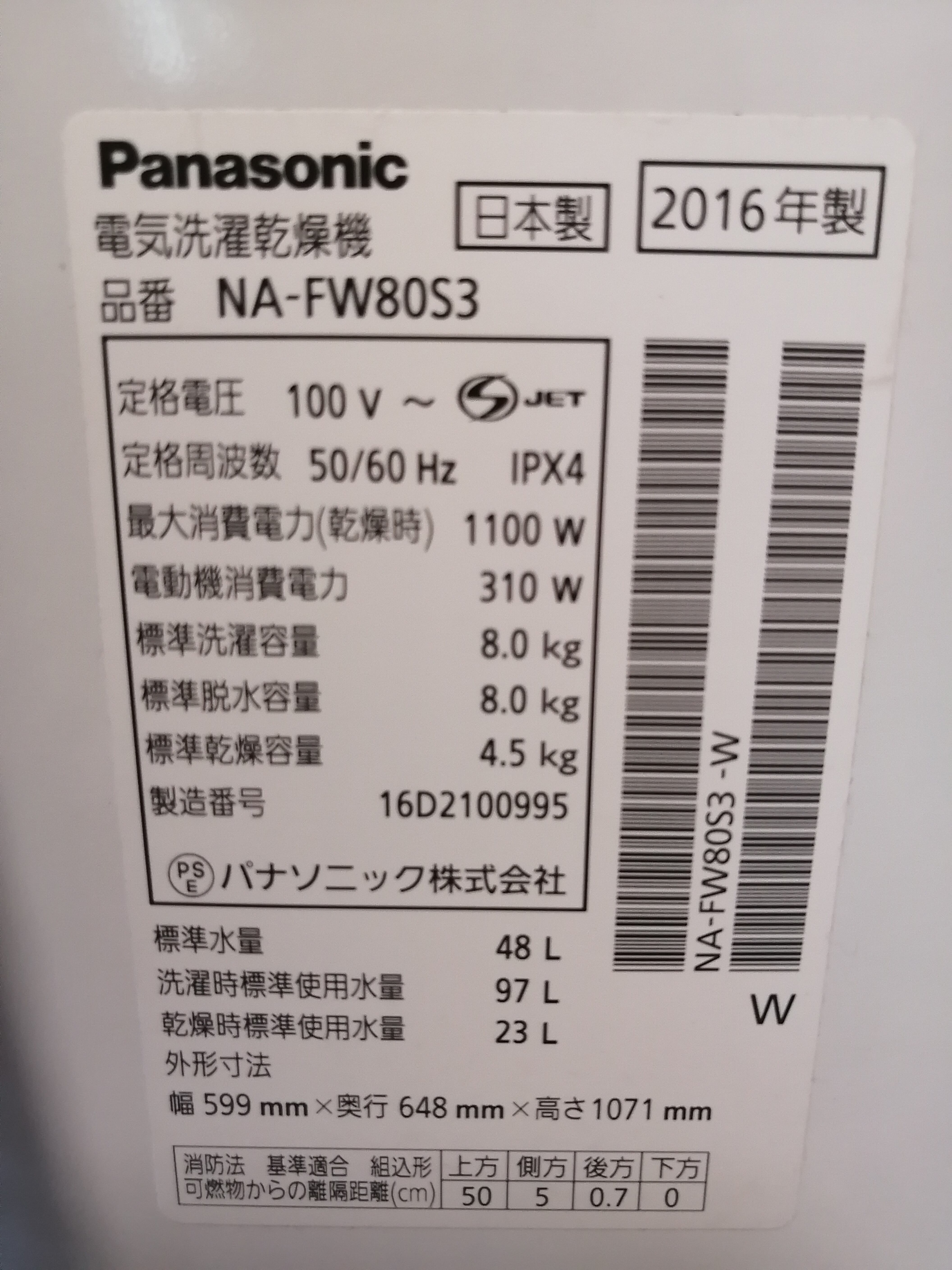 Panasonic 洗濯乾燥機 8kg 2016年 NA-FW80S3