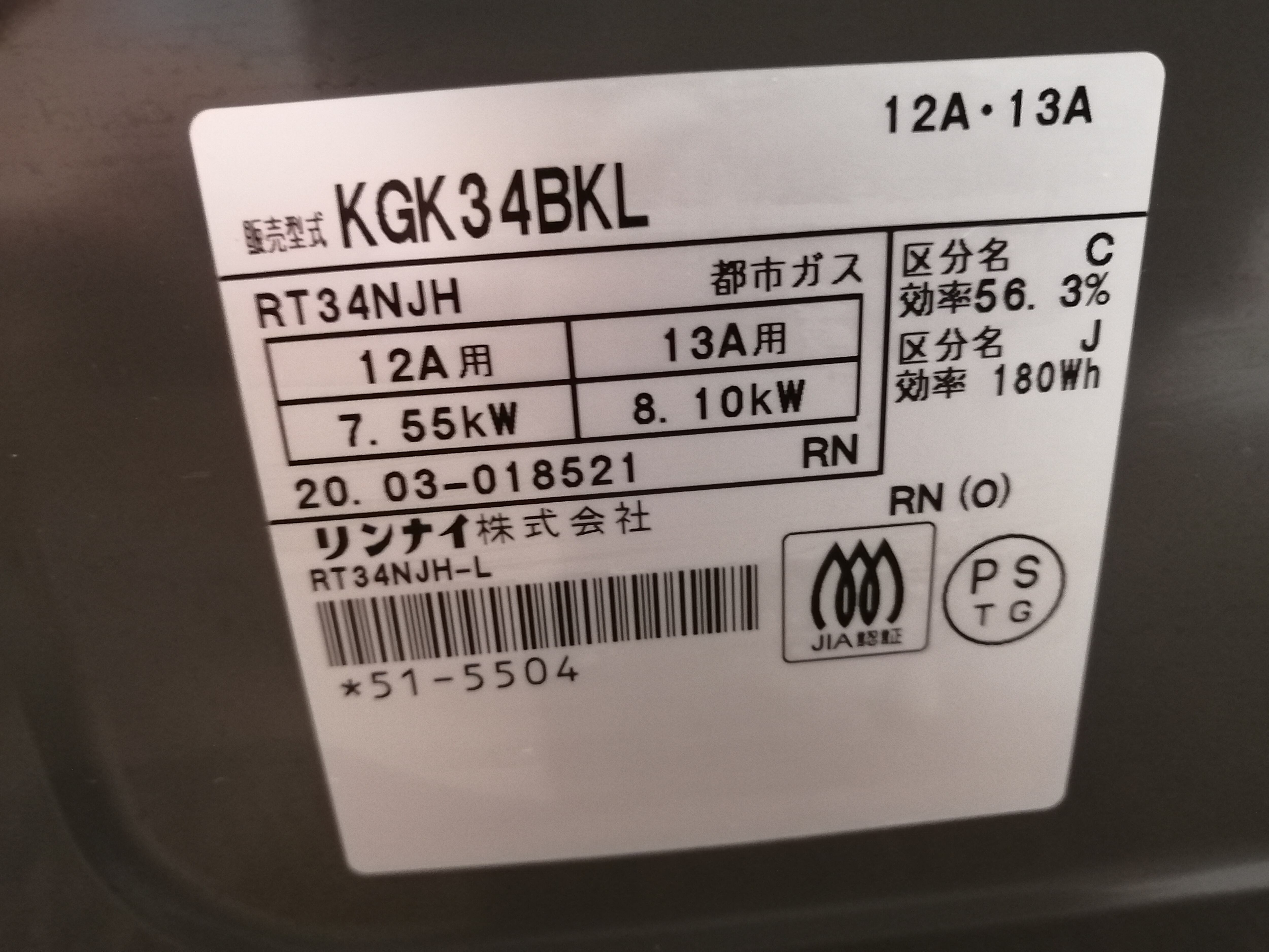 2020年製 リンナイ 都市ガス ガステーブル KGK34BKL