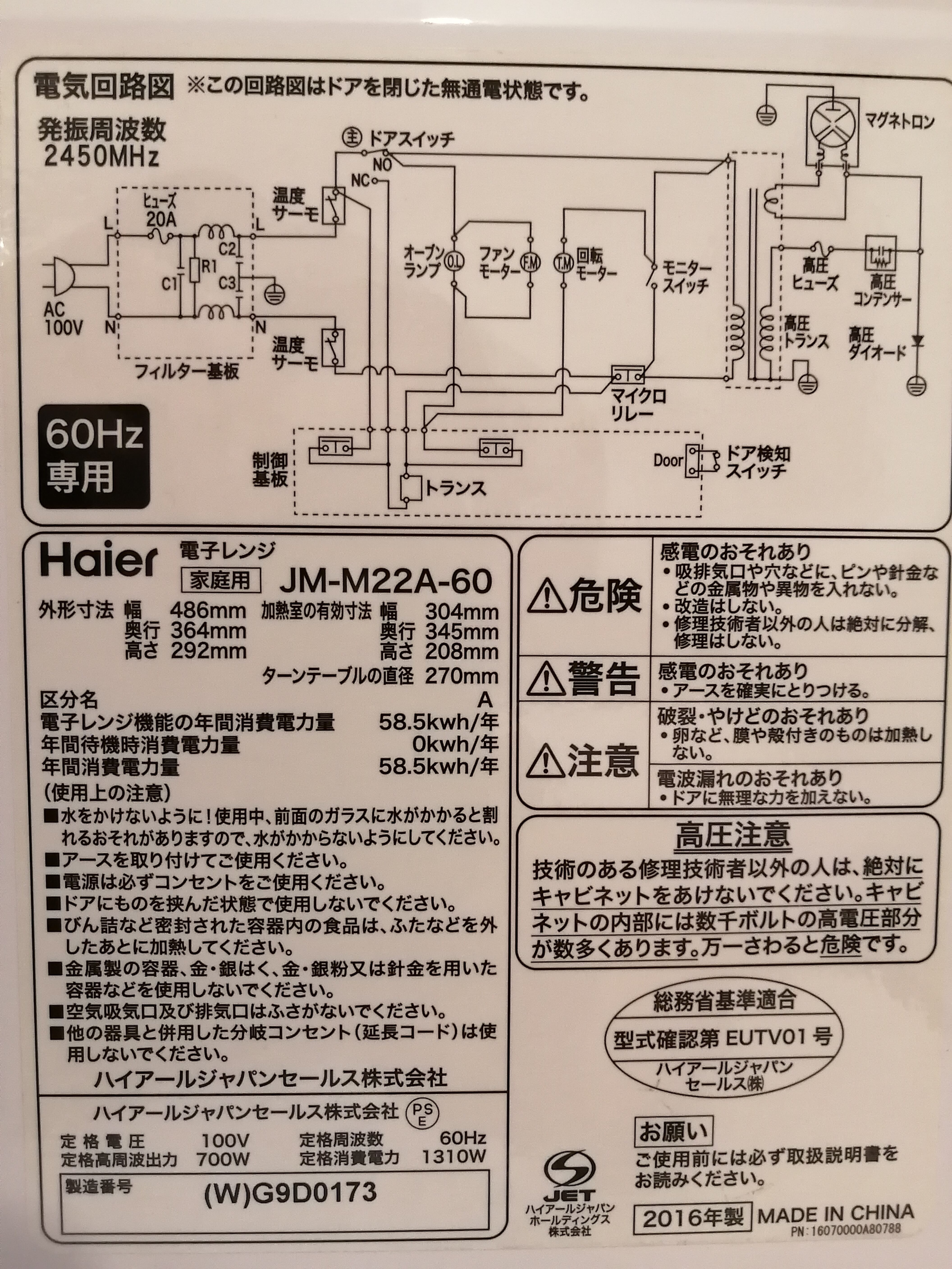 Haier 電子レンジ 60Hz専用 2016年 JM-M22A-60