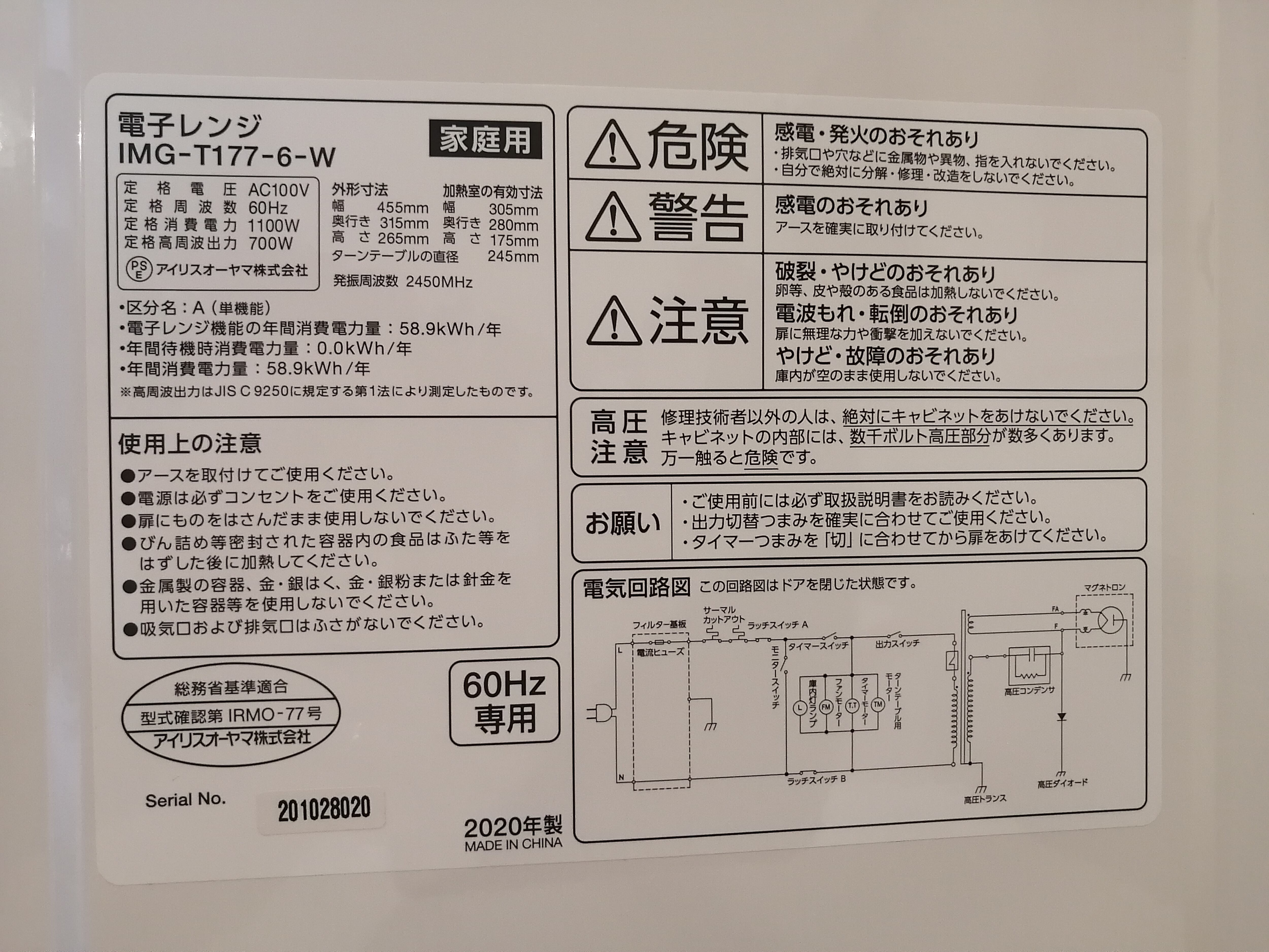 2020年製 IRIS 電子レンジ 60Hz専用 IMG-T177-6-W