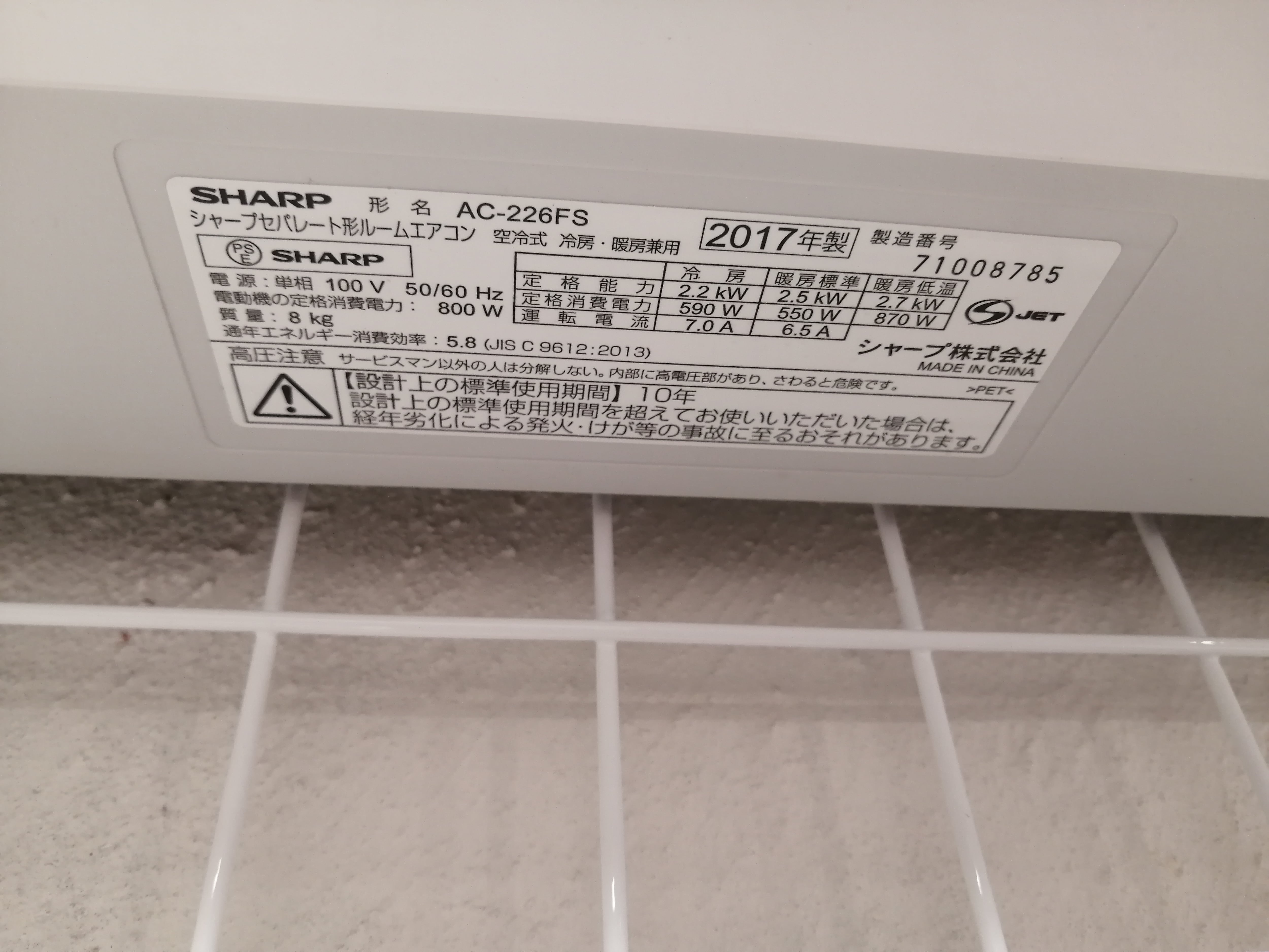 6畳 SHARP ルームエアコン 2017年 AC-226FS