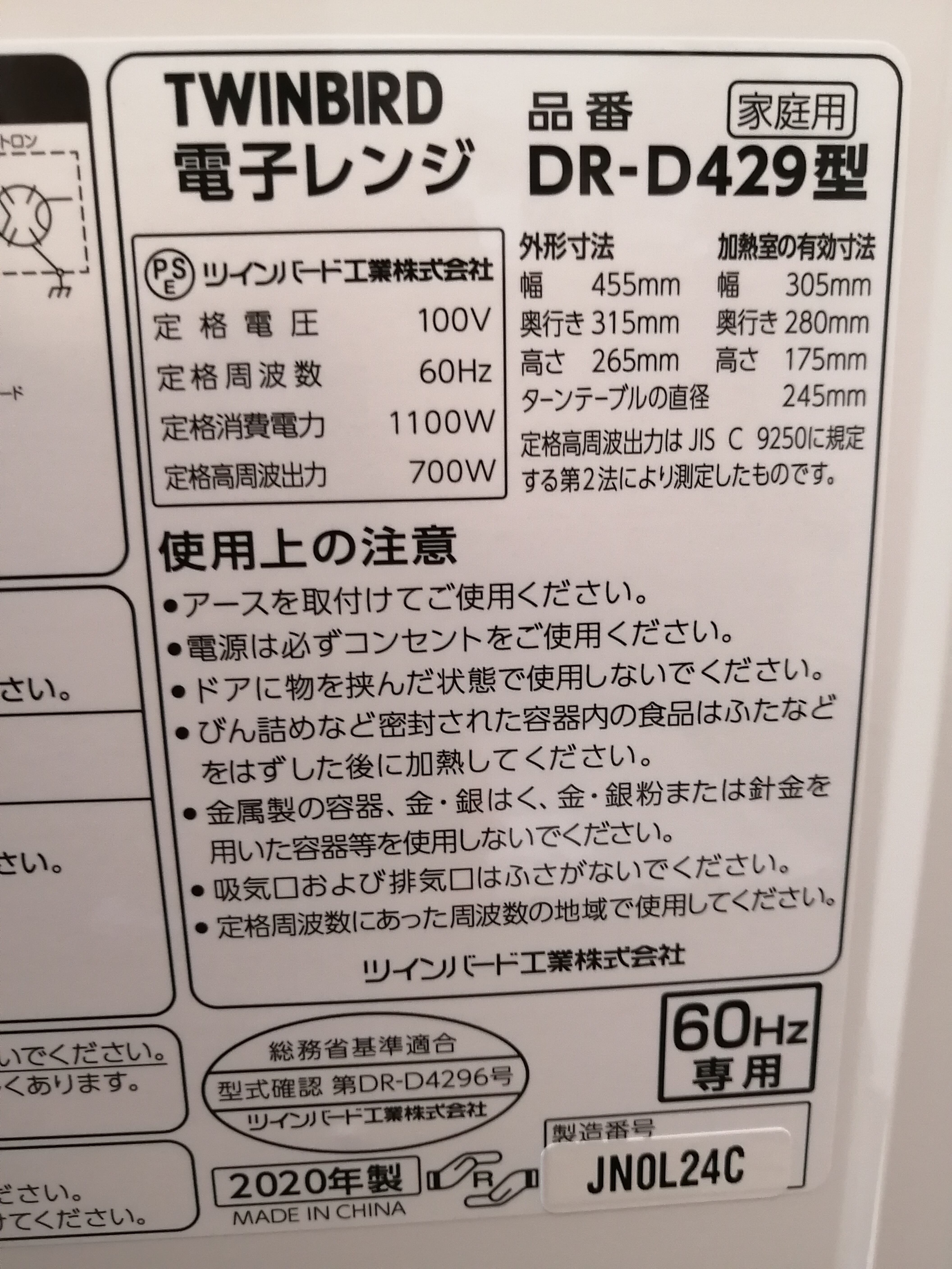 2020年製 TWINBIRD 電子レンジ 60Hz専用 DR-D429
