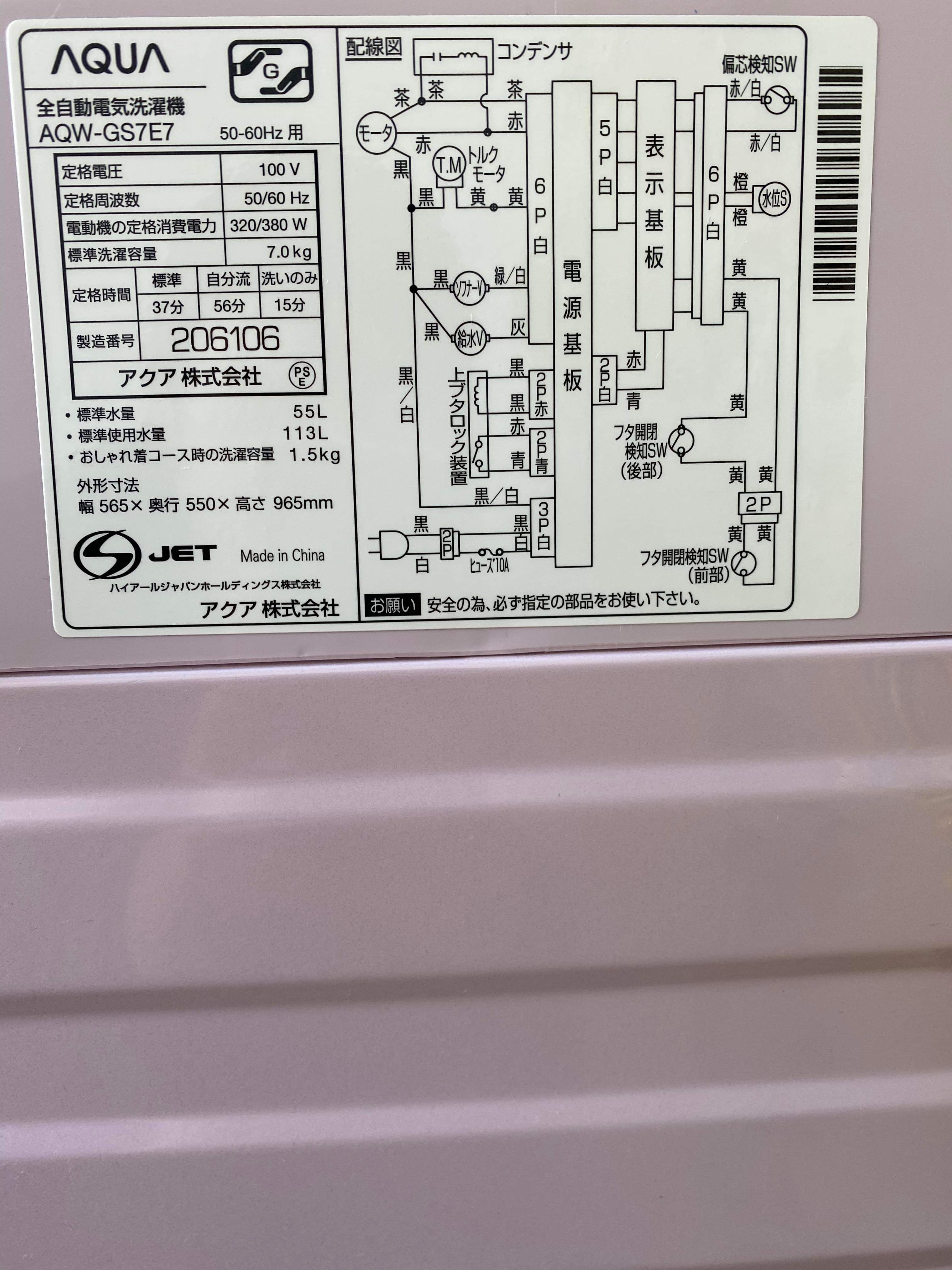 2020年製 AQUA 7kg AQW-GS7E7(P)