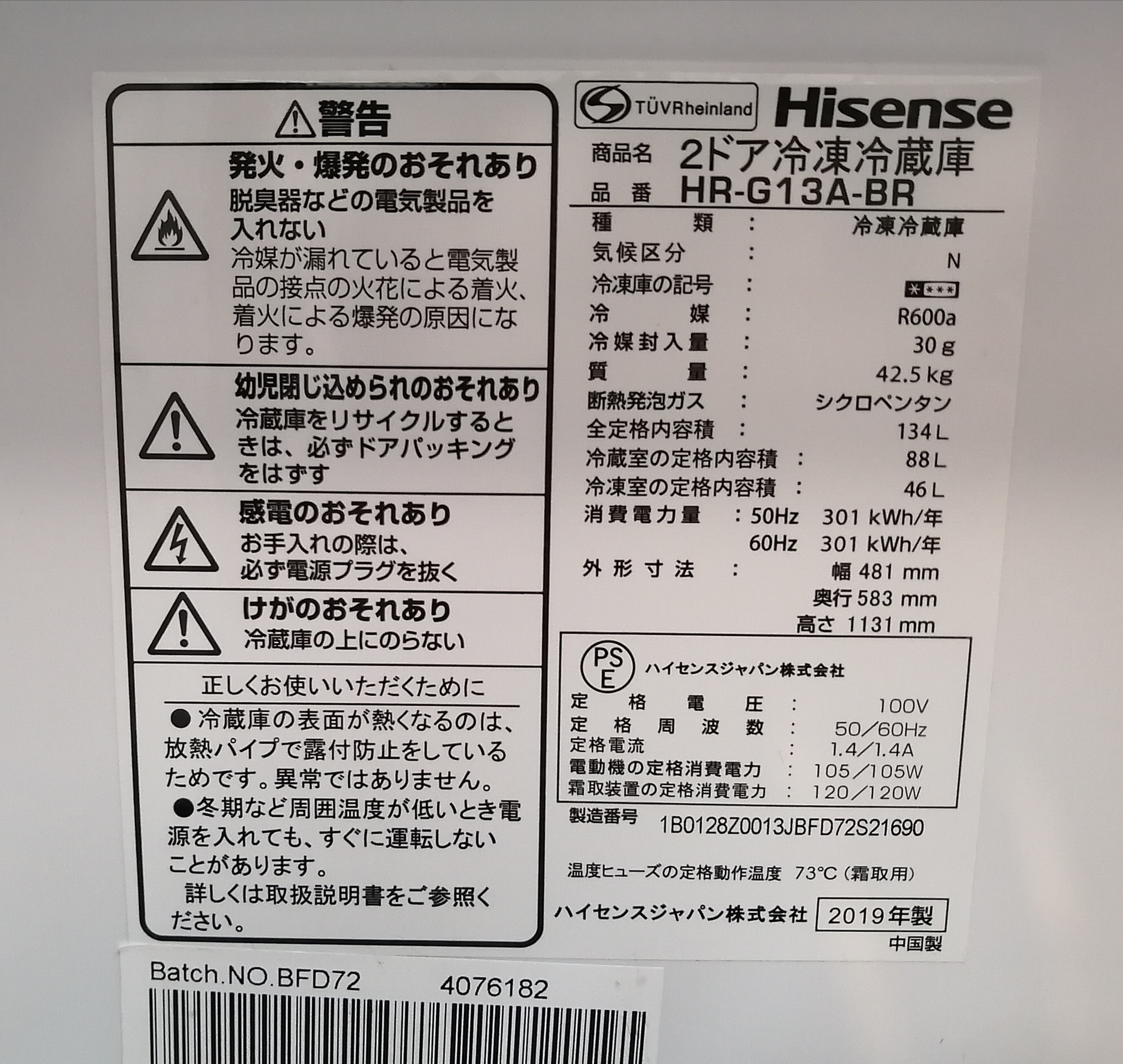 Hisense 2ドア冷凍冷蔵庫 134L 2019年 HR-G13A-BR