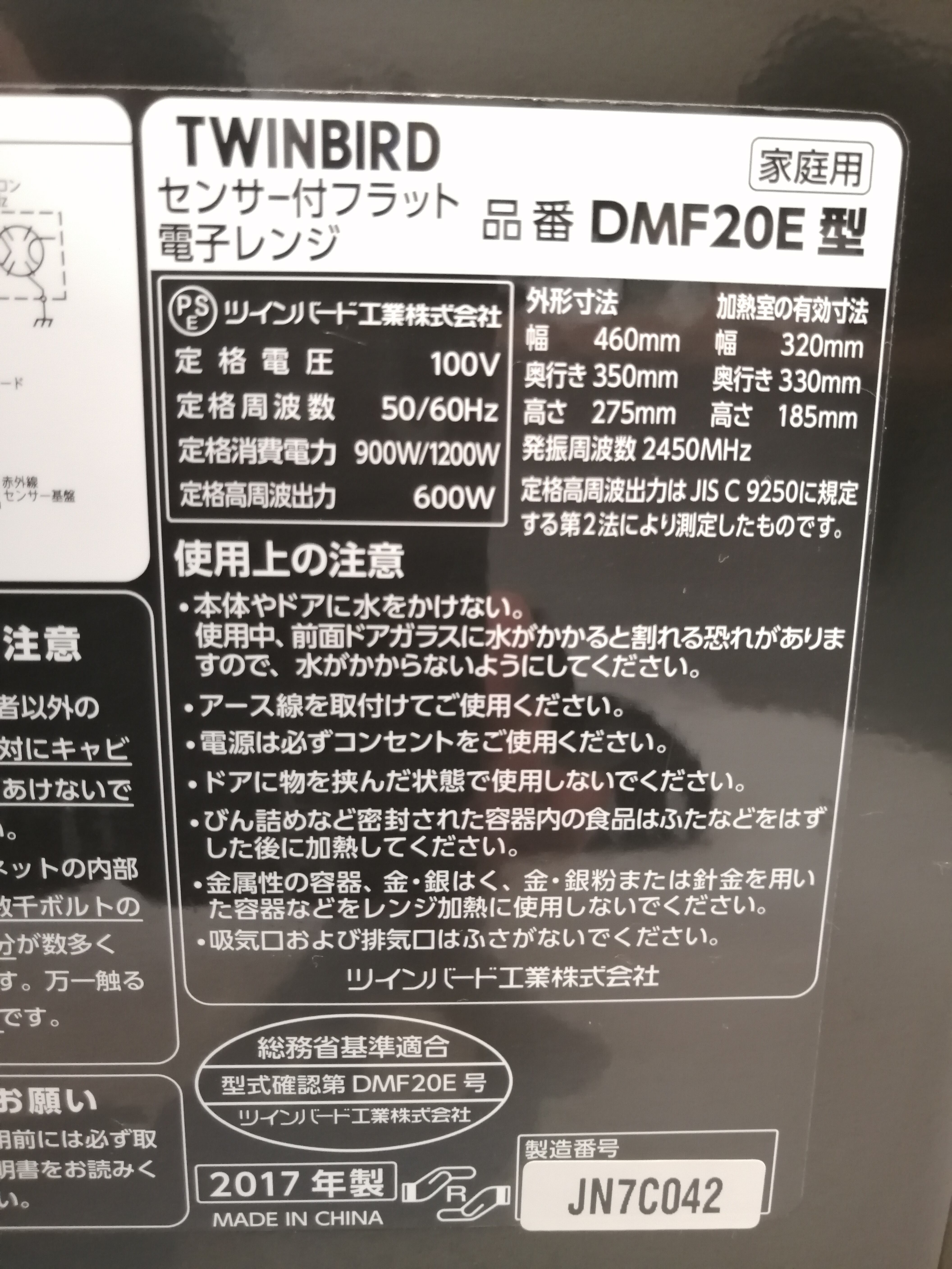 【全国発送可能】TWINBIRD センサー付フラット電子レンジ 2017年 DMF20E