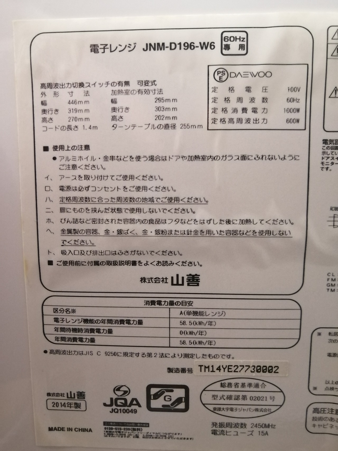【全国発送可能】YAMAZEN 電子レンジ 60Hz専用 2014年 JNM-D196-W6