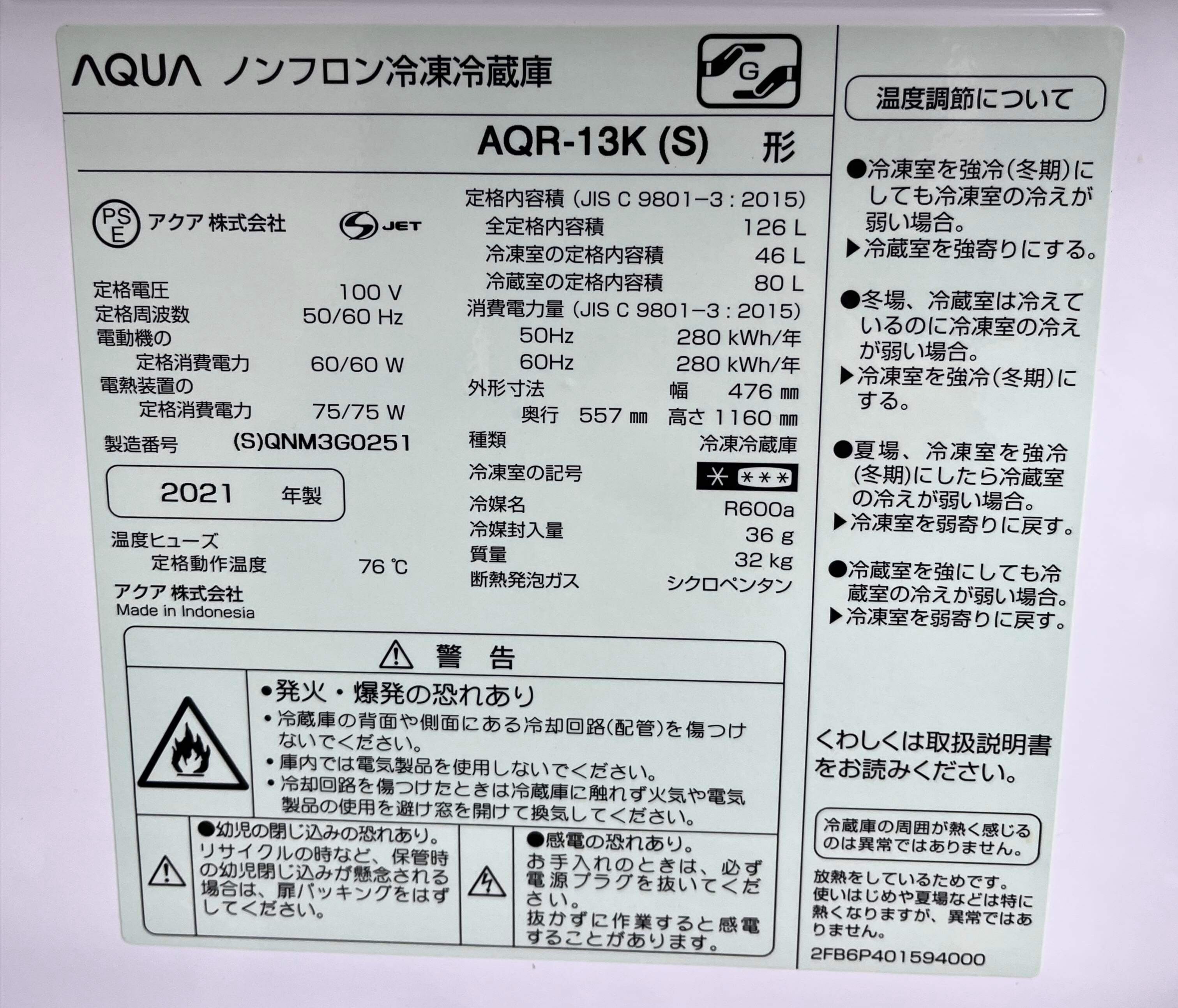 2021年製☆ AQUA ノンフロン冷凍冷蔵庫 126L AQR-13K(S)