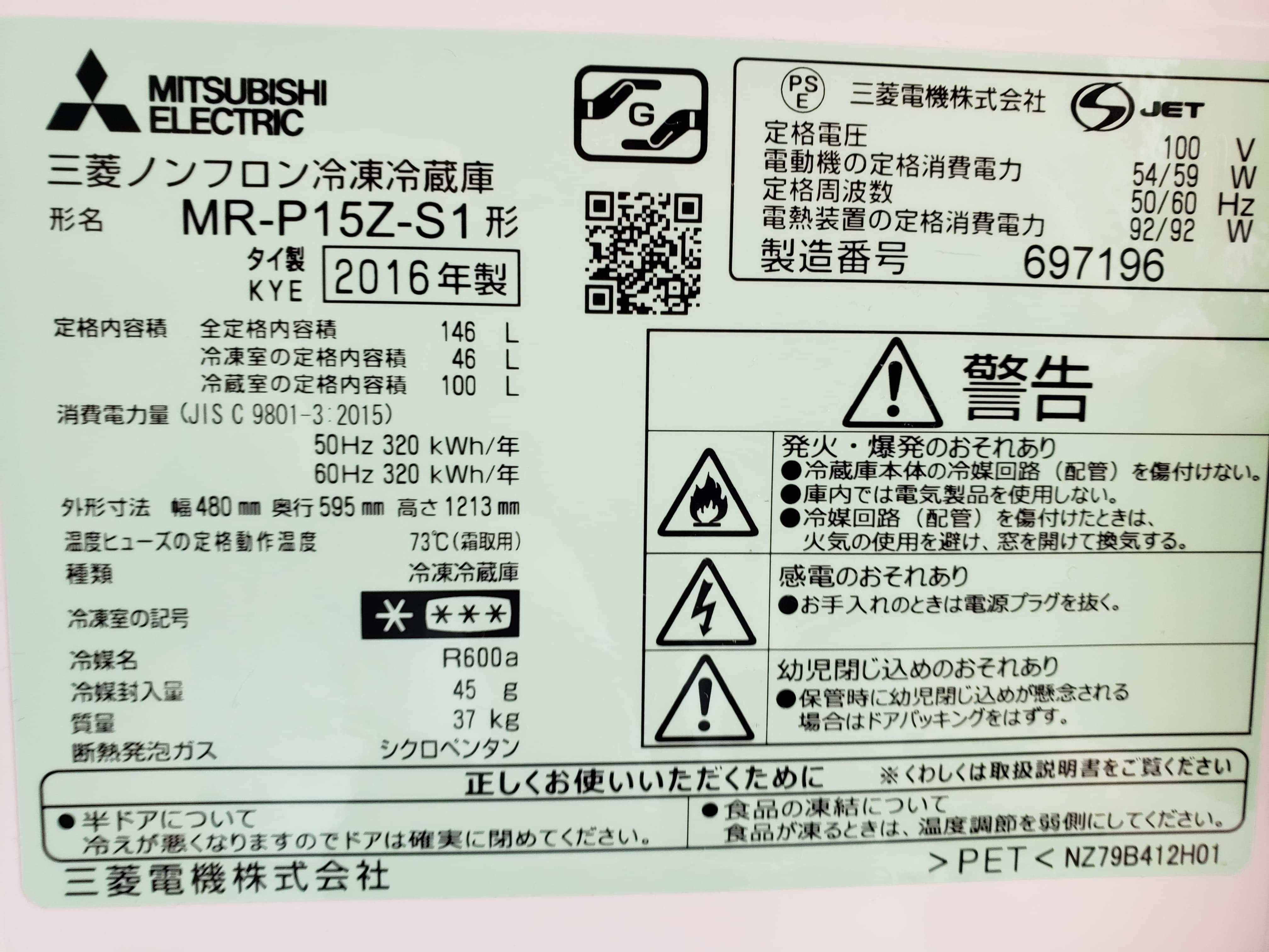 MITSUBISHI ノンフロン冷凍冷蔵庫 146L 2016年 MR-P15Z-S1