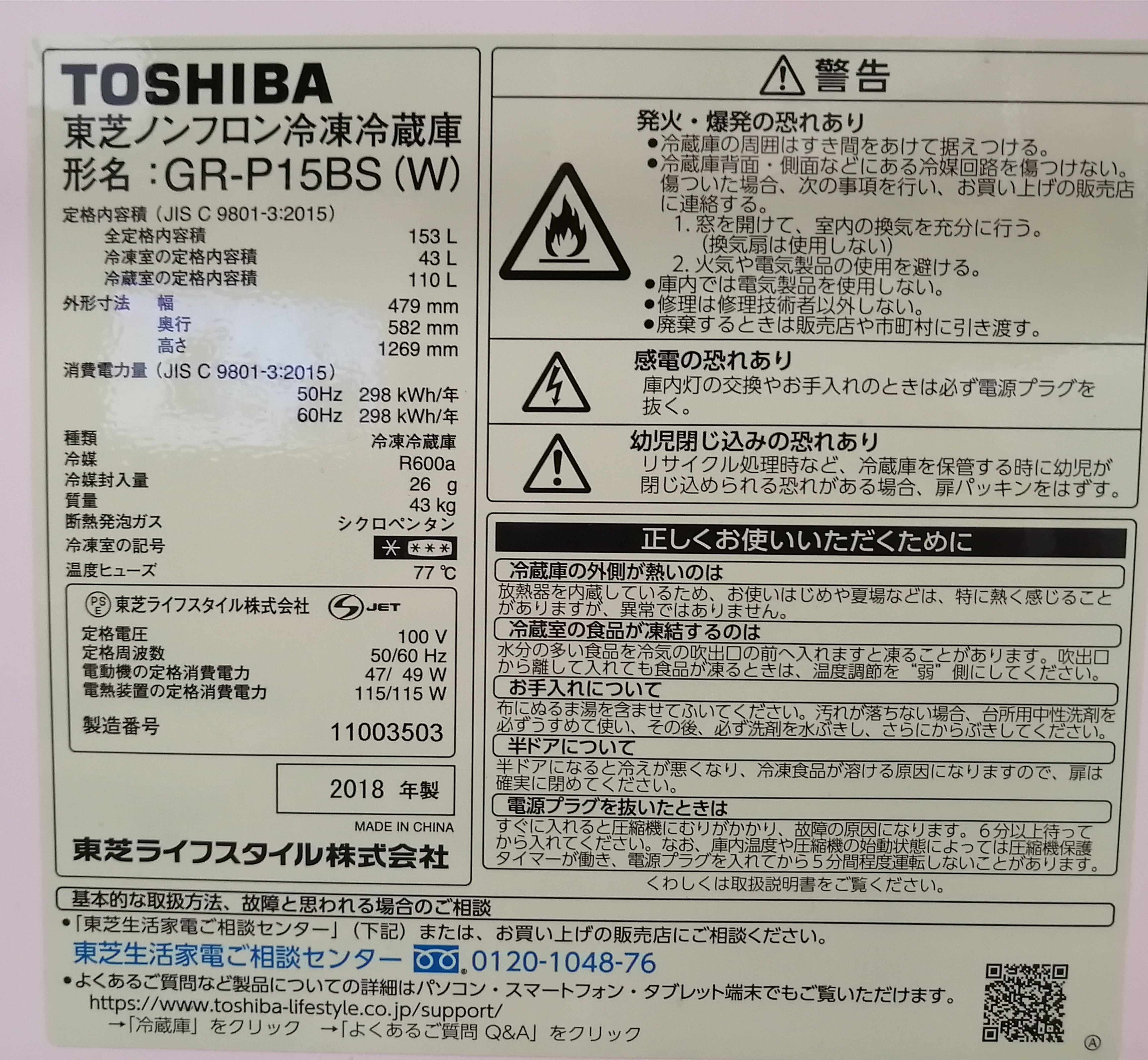 TOSHIBA ノンフロン冷凍冷蔵庫 153L 2018年 GR-P15BS(W)