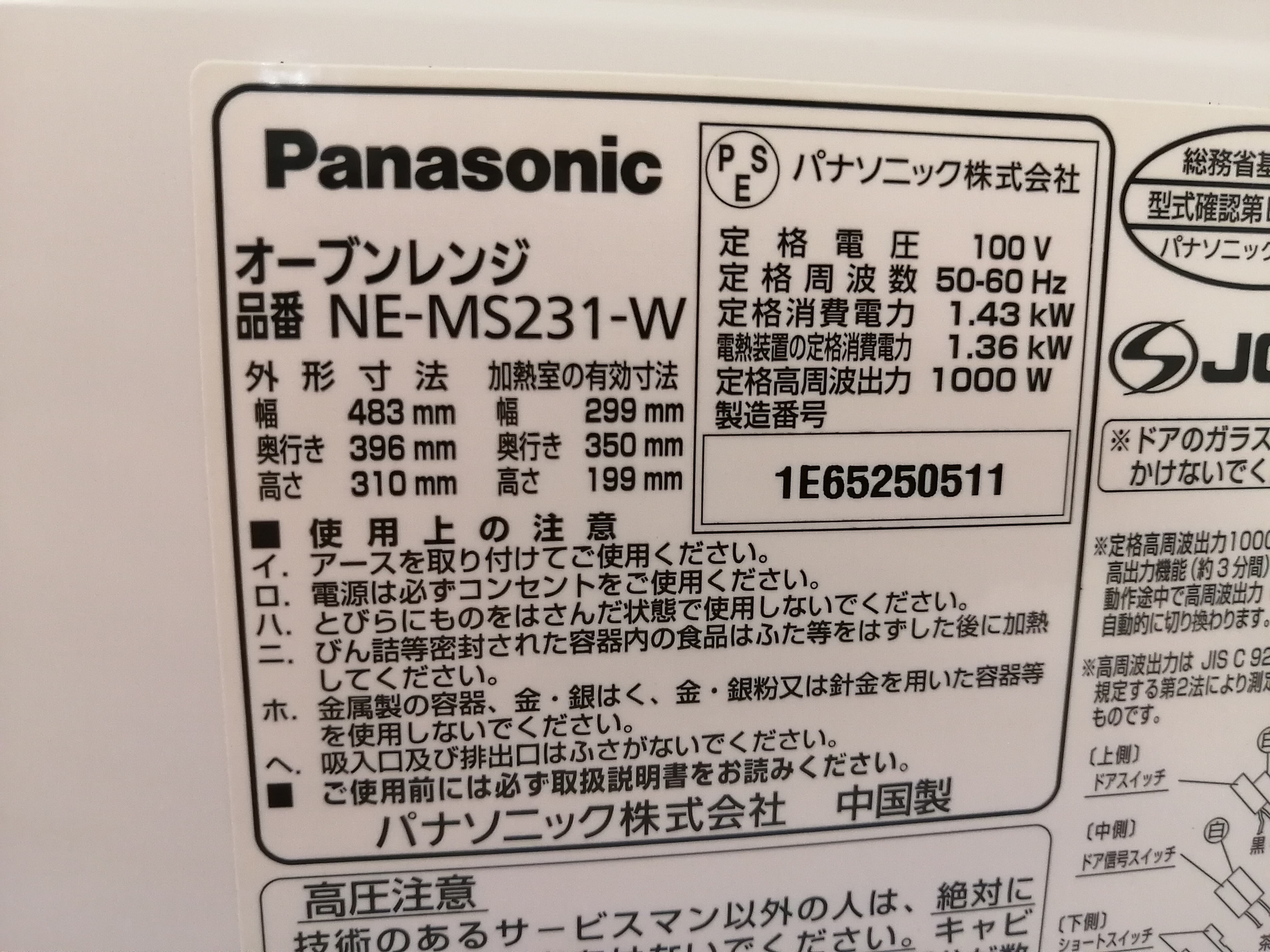【全国発送可能】Panasonic オーブンレンジ 2015年 NE-MS231-W