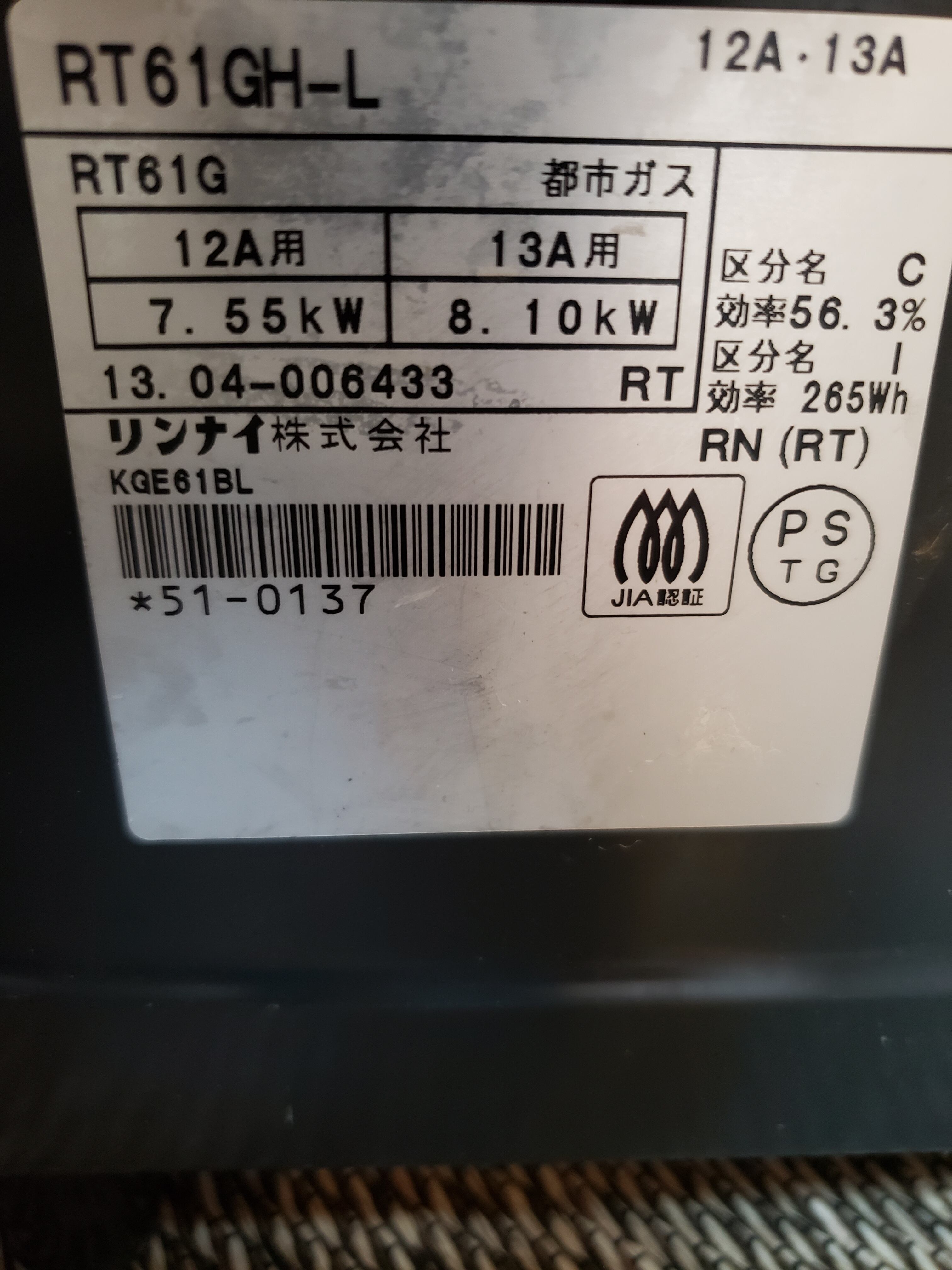 リンナイ 都市ガス用 ガステーブル 2013年 RT61GH-L