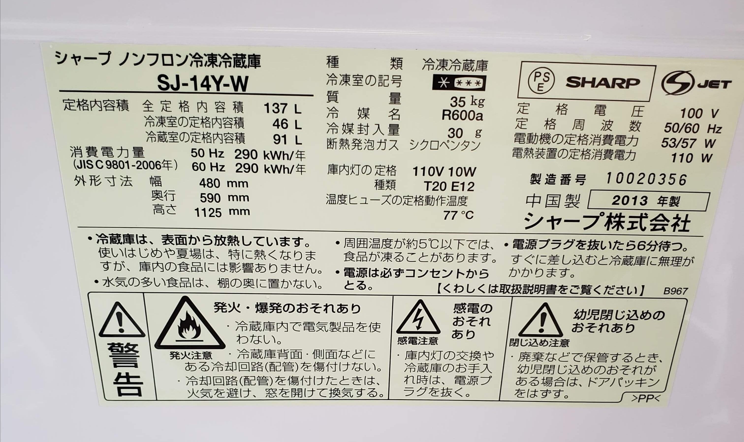 2013年製 SHARP ノンフロン冷凍冷蔵庫 137L SJ-14Y-W
