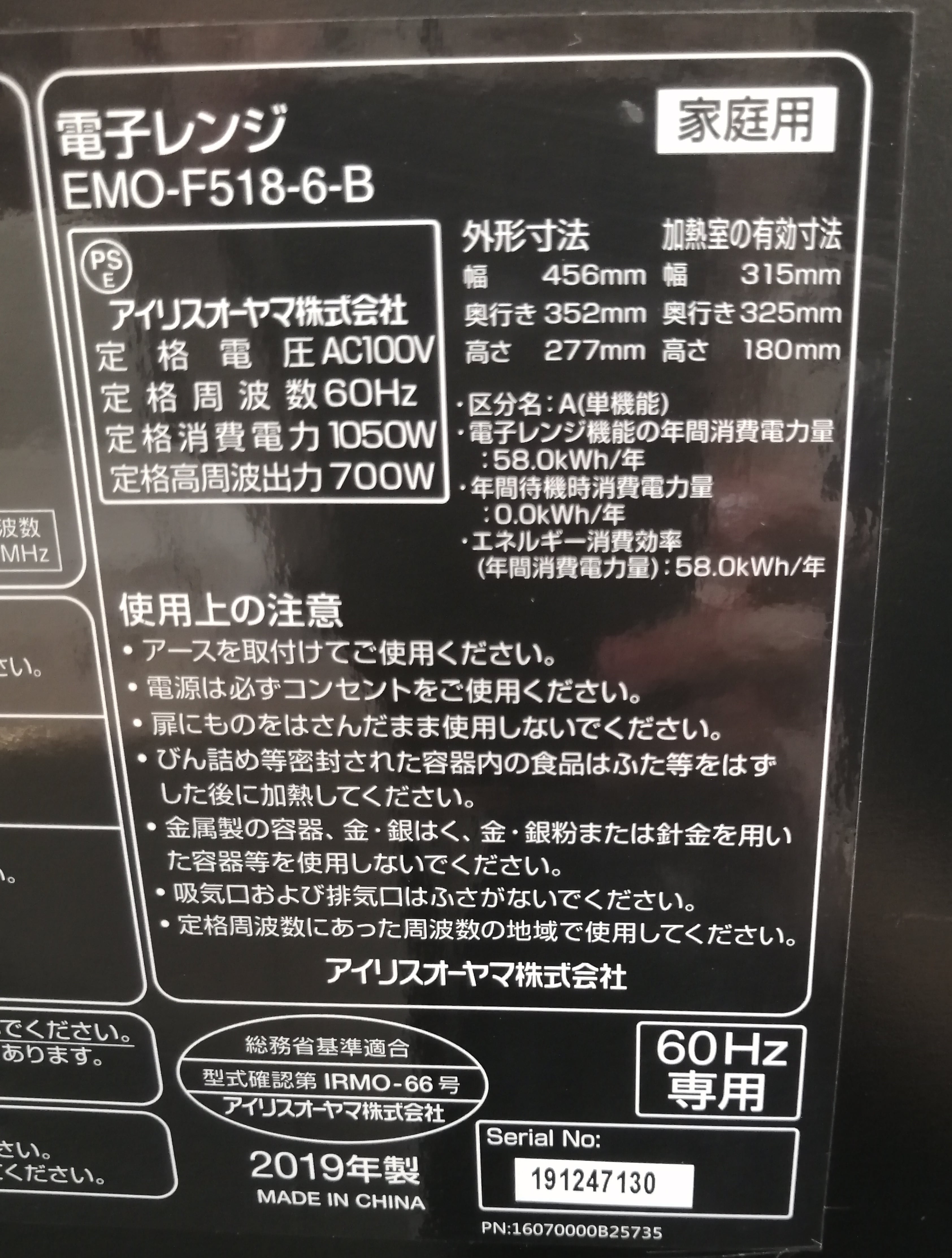 2019年製 IRIS フラット電子レンジ 60Hz専用 EMO-F518-6-B