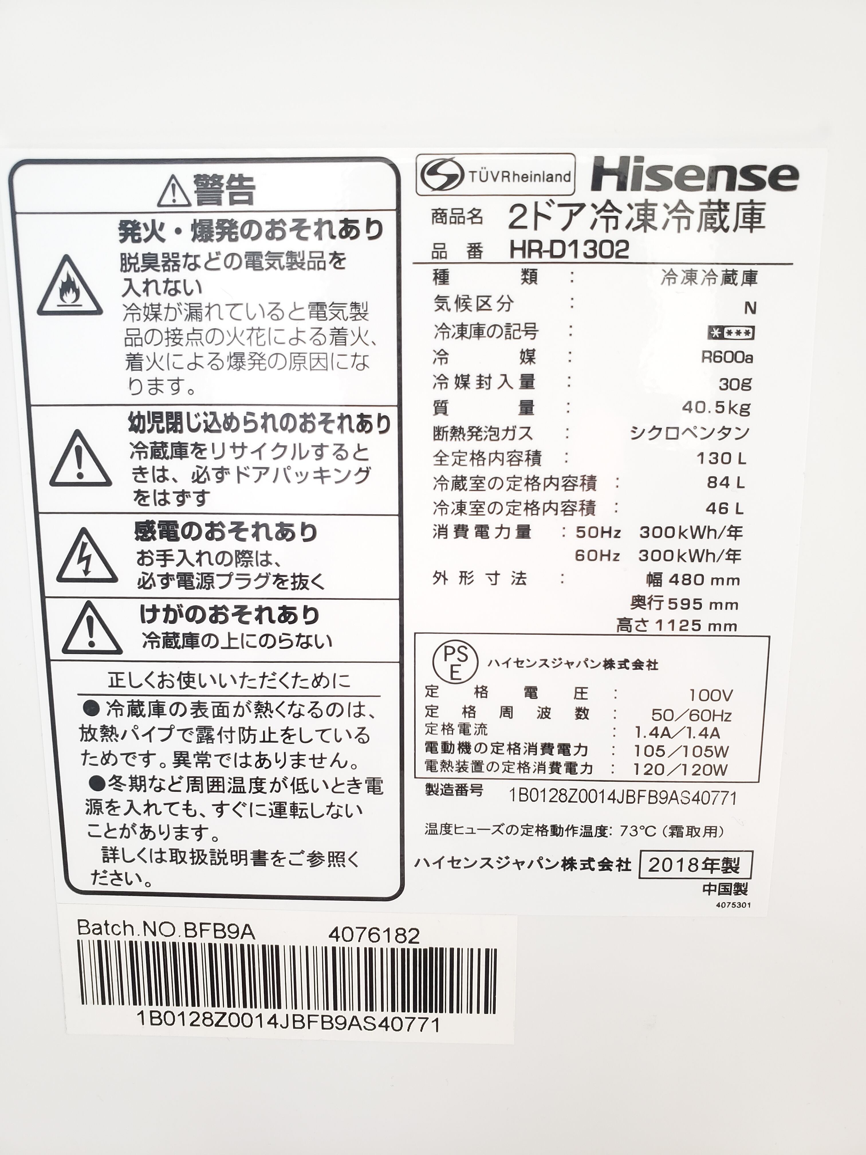 2018年製 Hisense 2ドア冷凍冷蔵庫 130L HR-D1302
