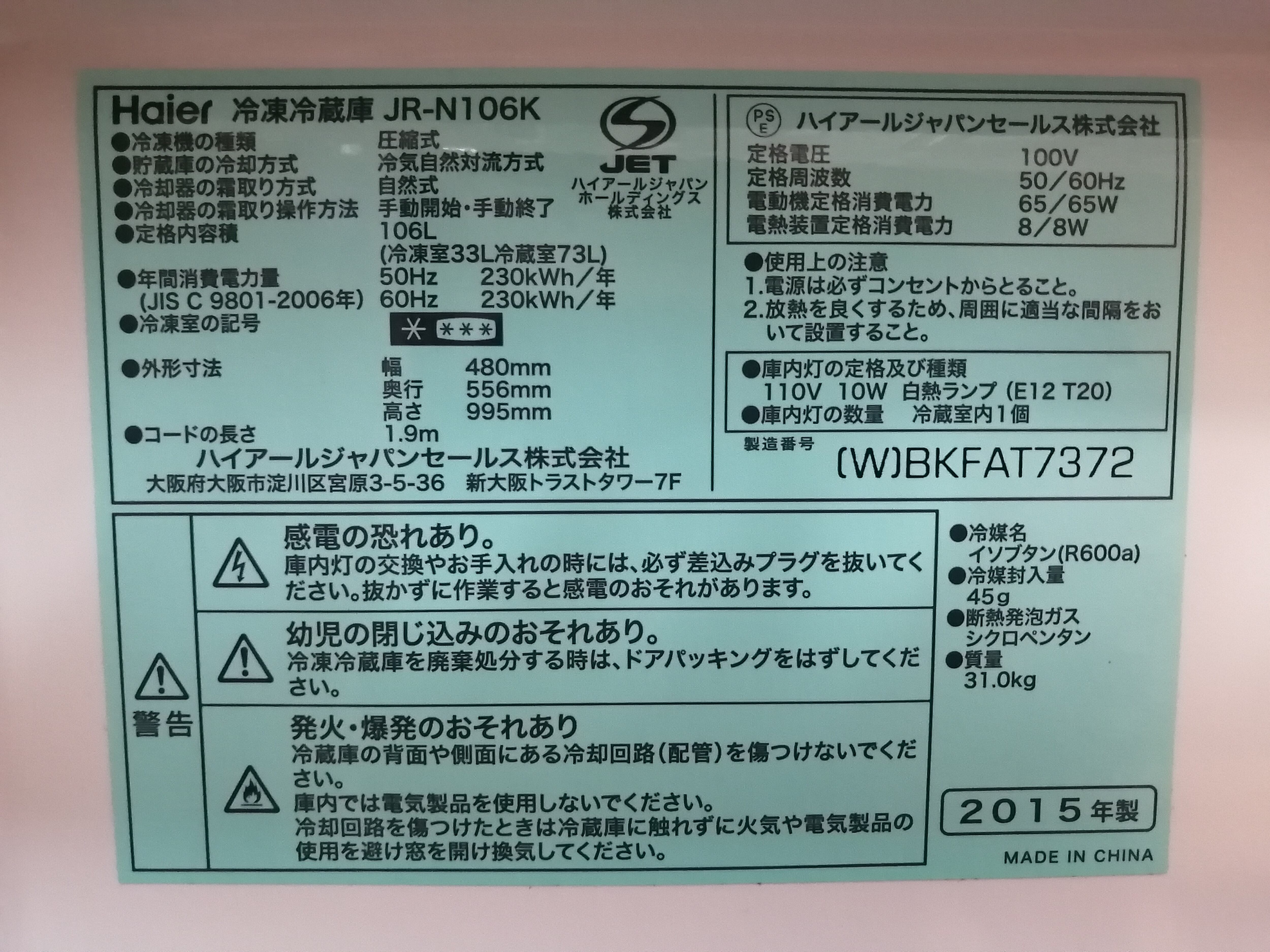 2015年製 Haier 冷凍冷蔵庫 106L JR-N106K