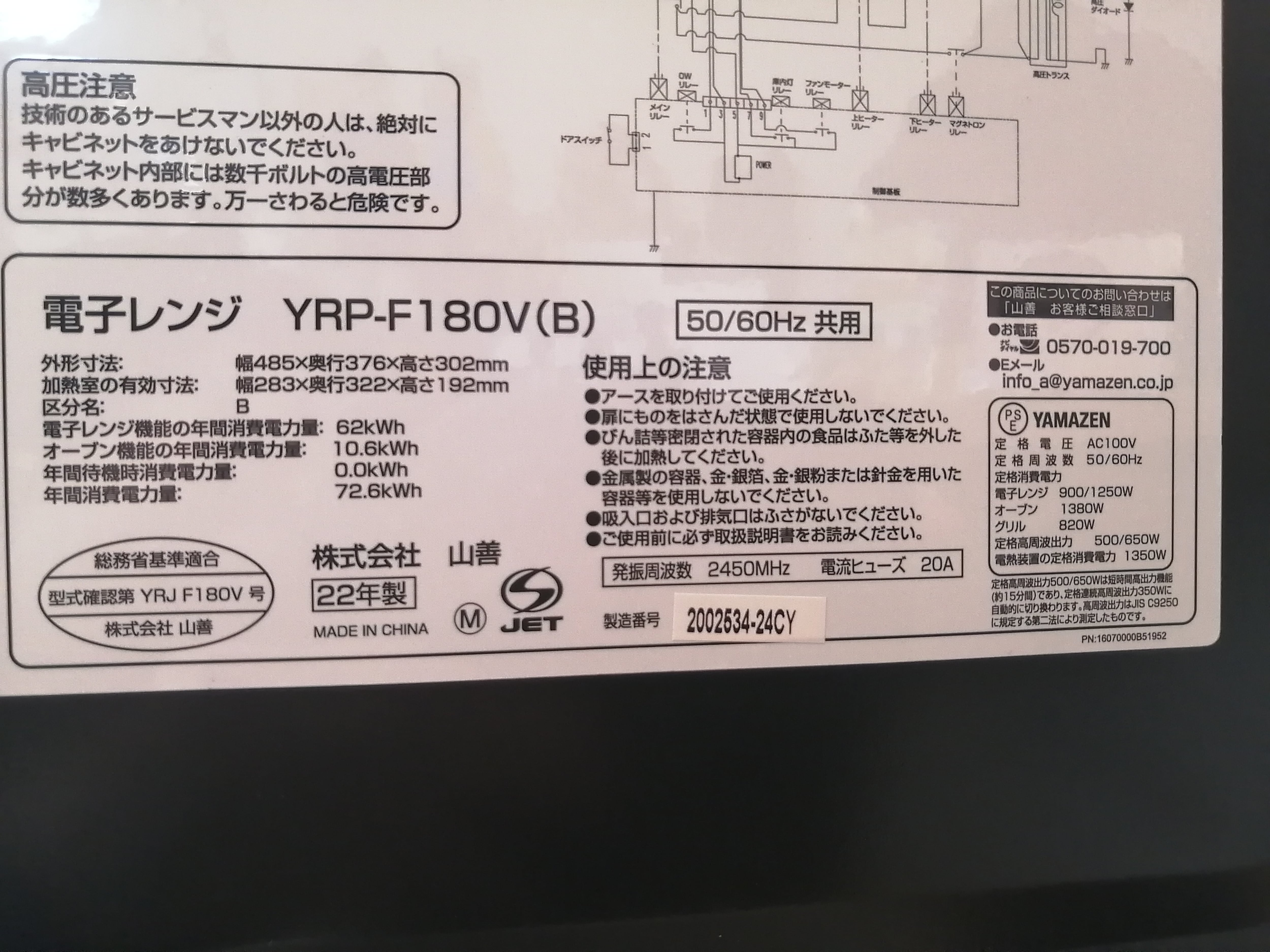 2022年製☆ YAMAZEN オーブンレンジ YRP-F180V(B)