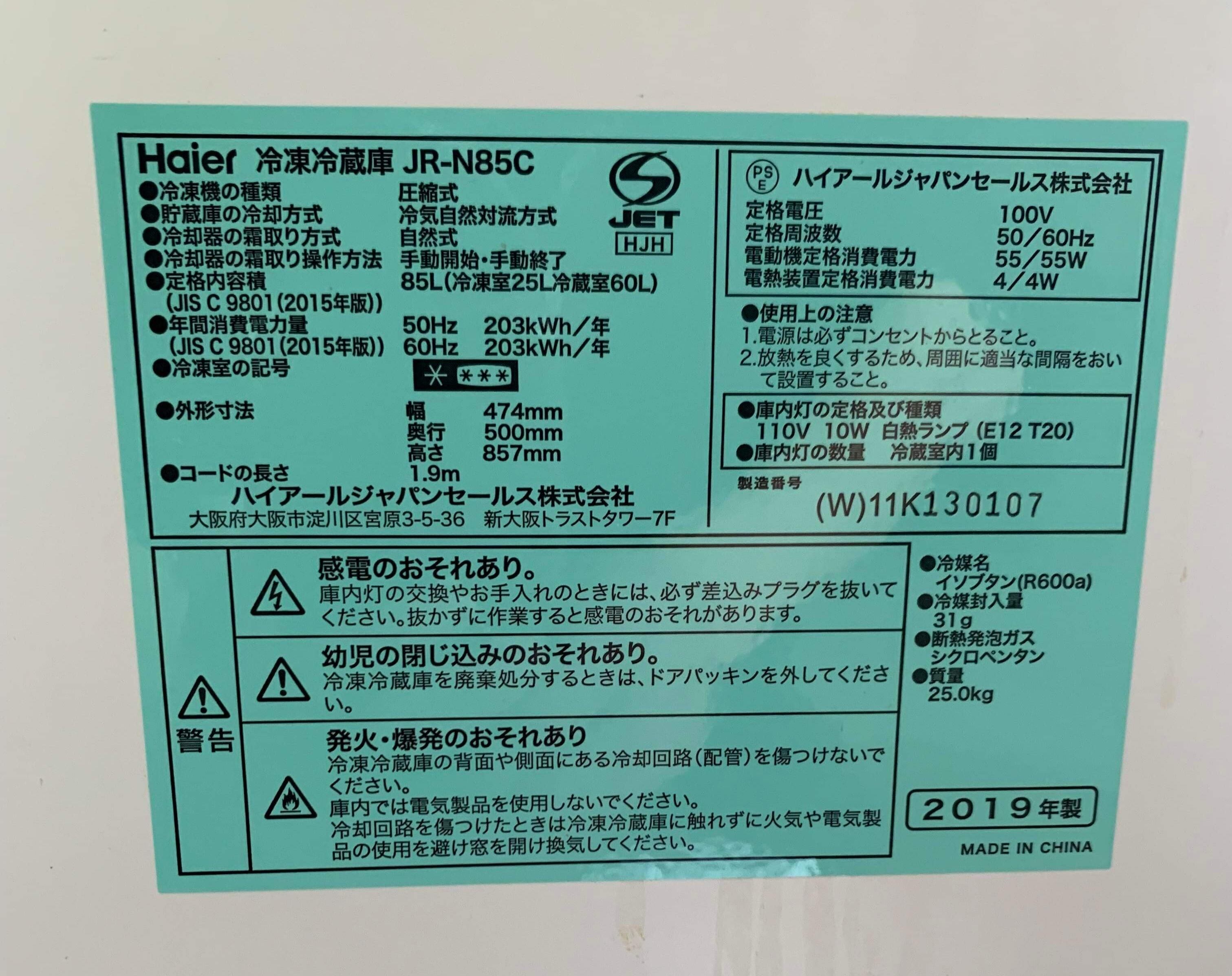 2019年製 Haier 冷凍冷蔵庫 85L JR-N85C