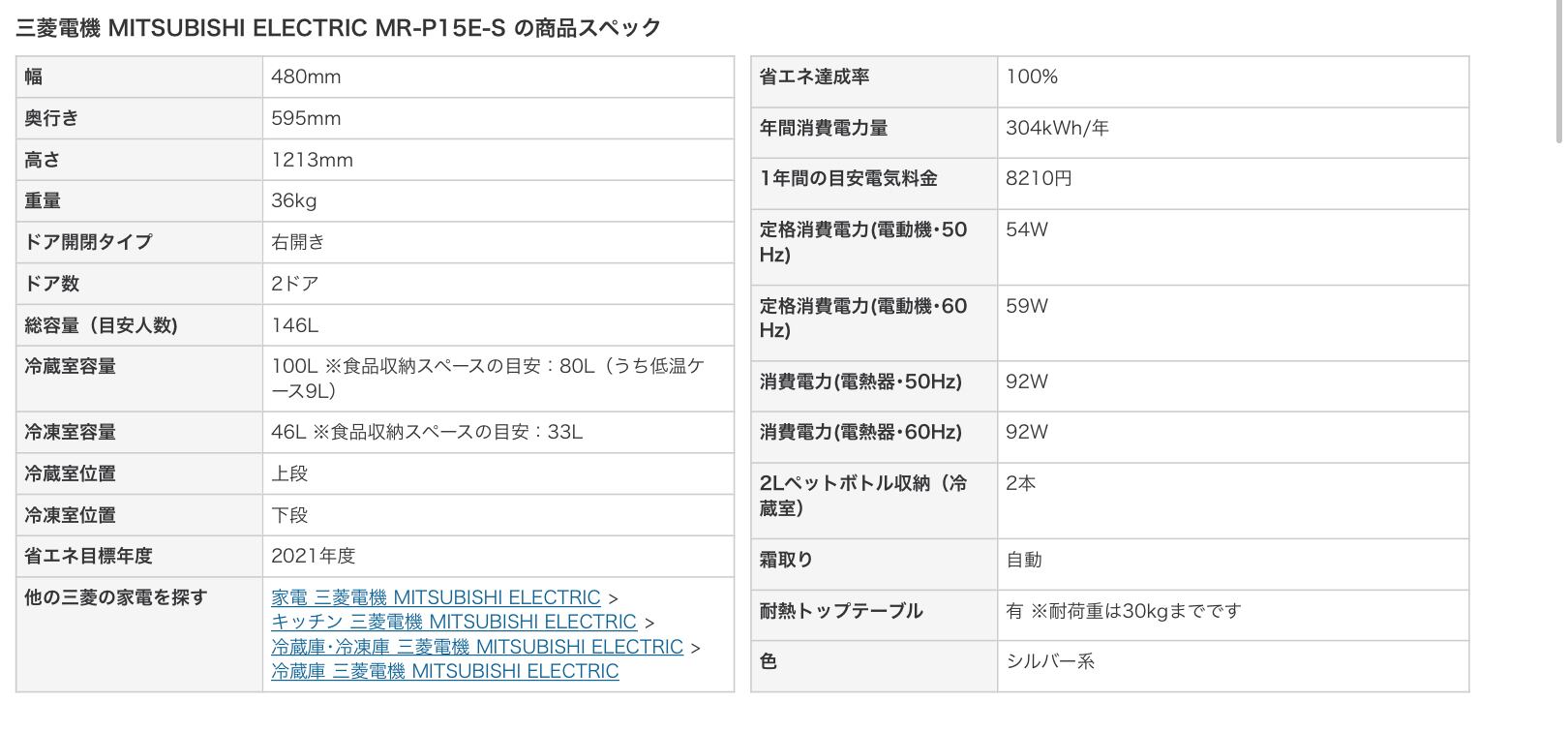 2020年製 MITSUBISHI ノンフロン冷凍冷蔵庫 146L MR-P15E-S1