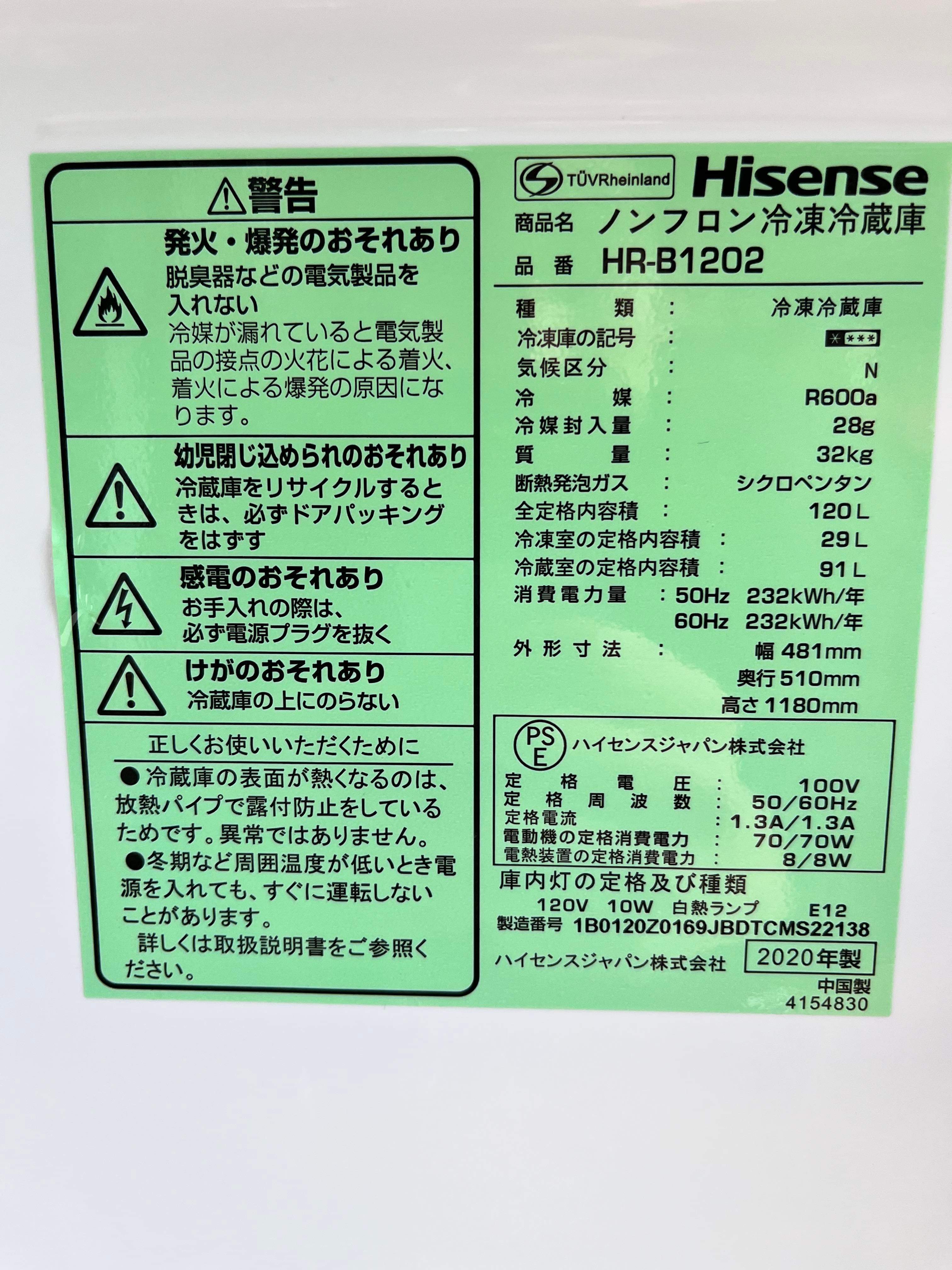 2020年製 Hisense ノンフロン冷凍冷蔵庫 120L HR-B1202