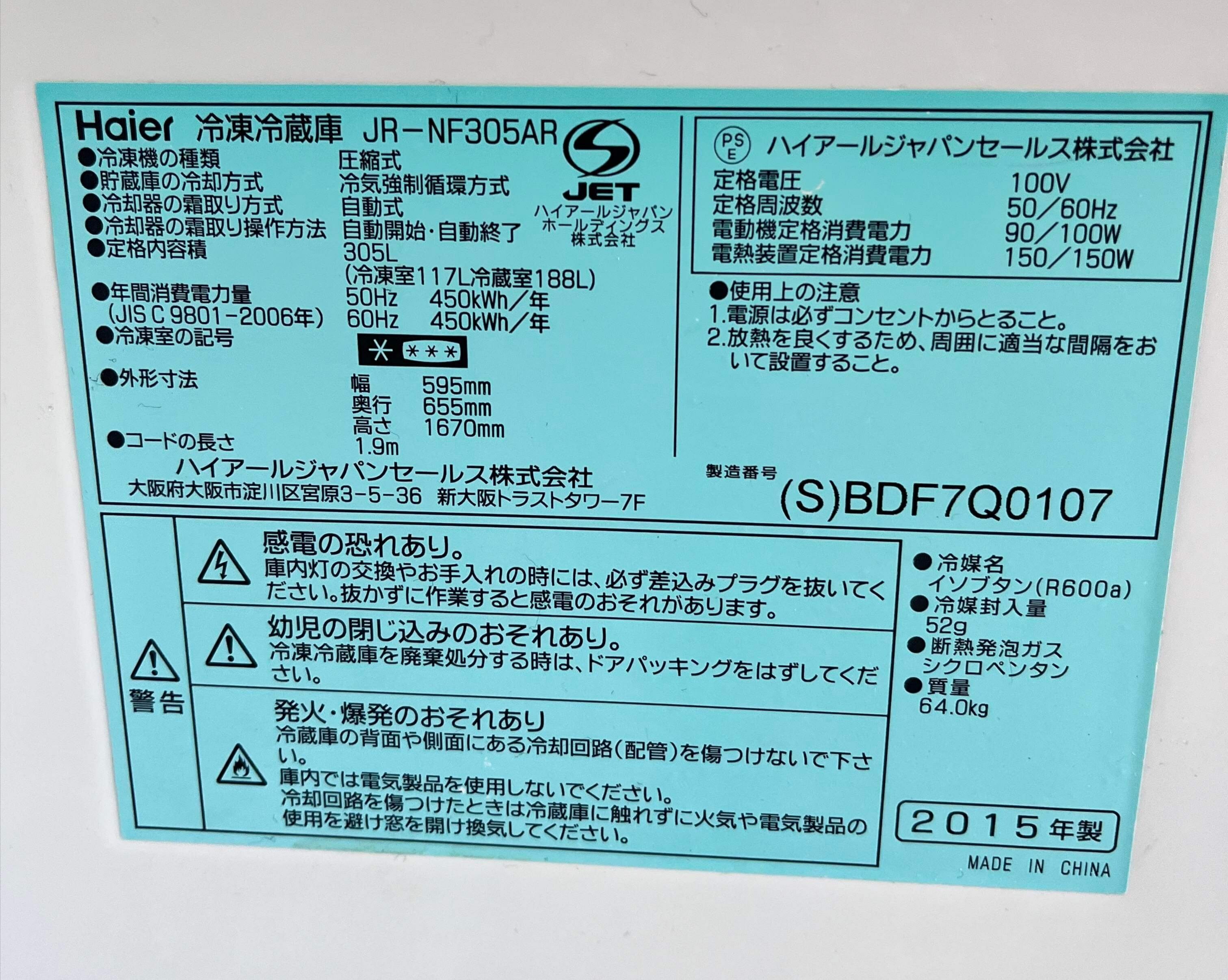 2015年製 Haier 冷凍冷蔵庫 305L JR-NF305AR