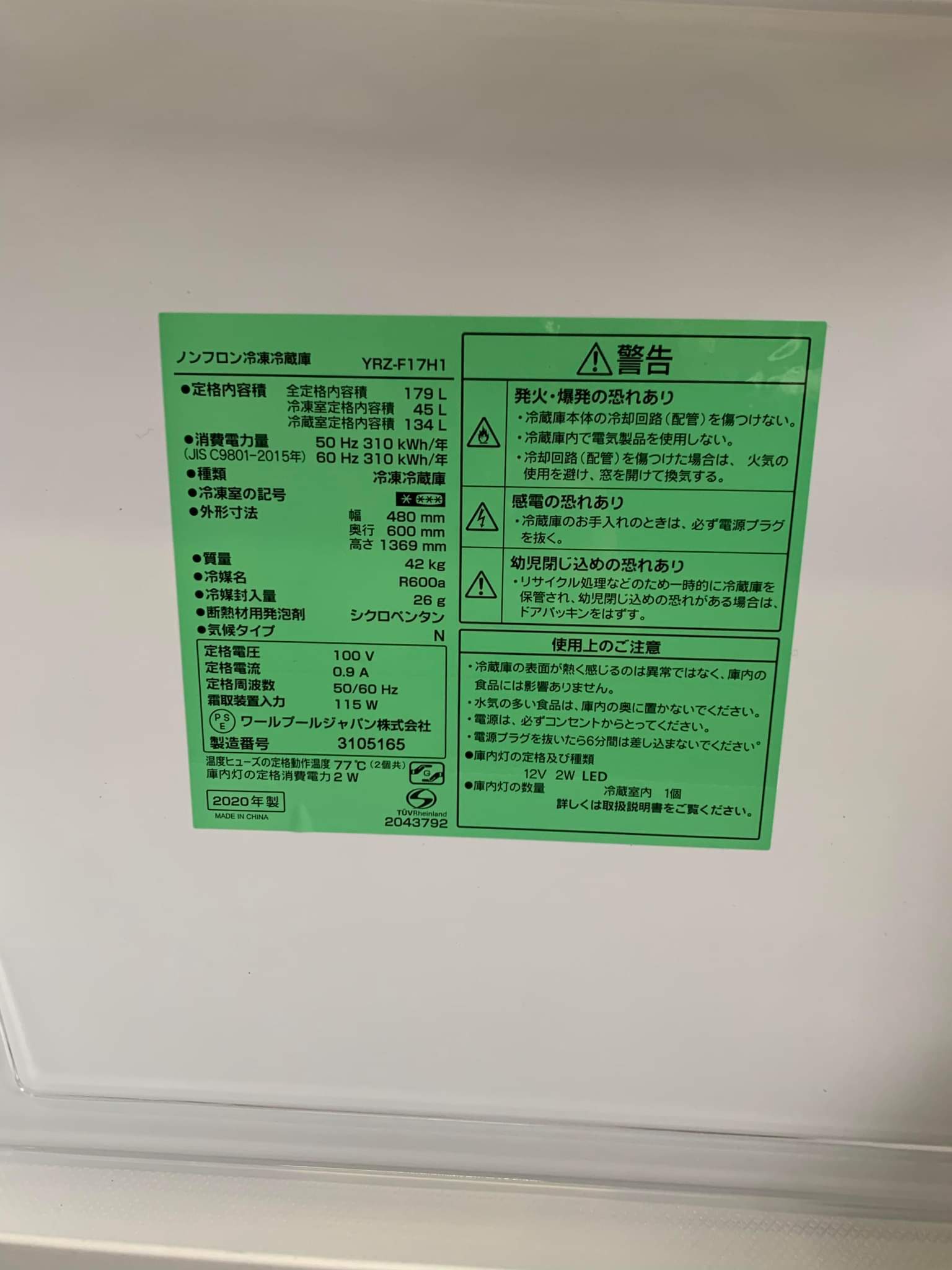 大容量 2020年製 YAMADA ノンフロン冷凍冷蔵庫 179L YRZ-F17H1
