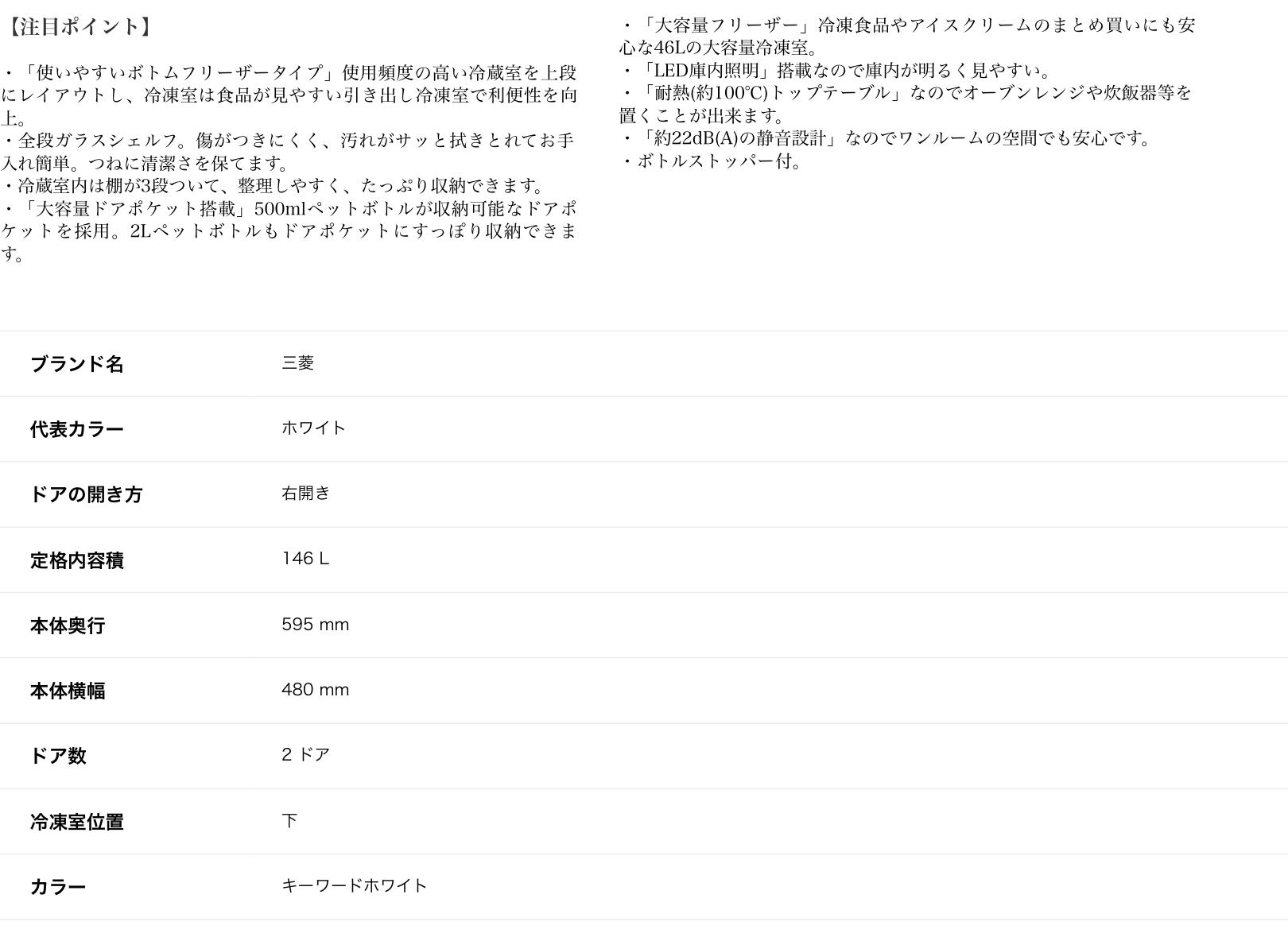 2018年製 MITSUBISHI ノンフロン冷凍冷蔵庫 146L MR-P15ED-KW