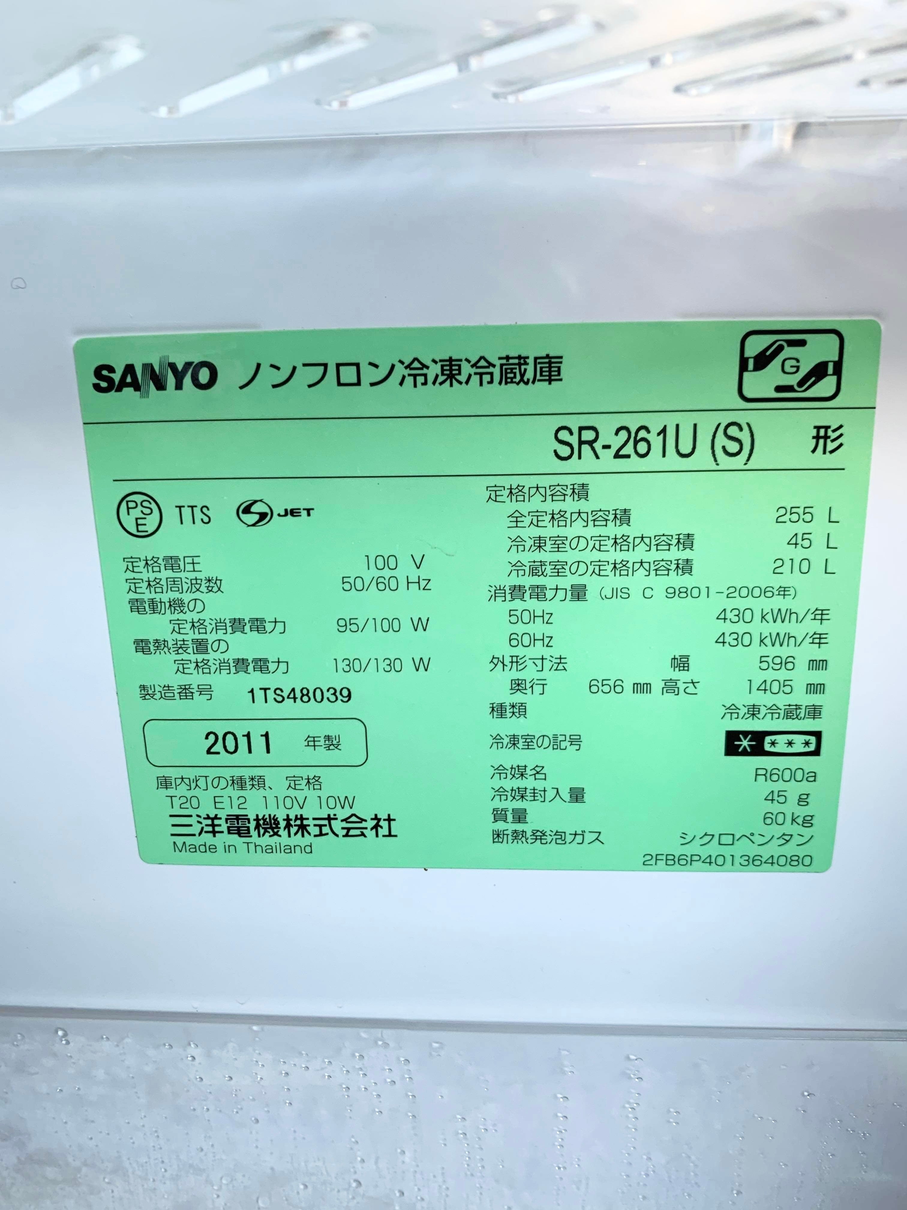 2011年製 SANYO ノンフロン冷凍冷蔵庫 255L SR-261U