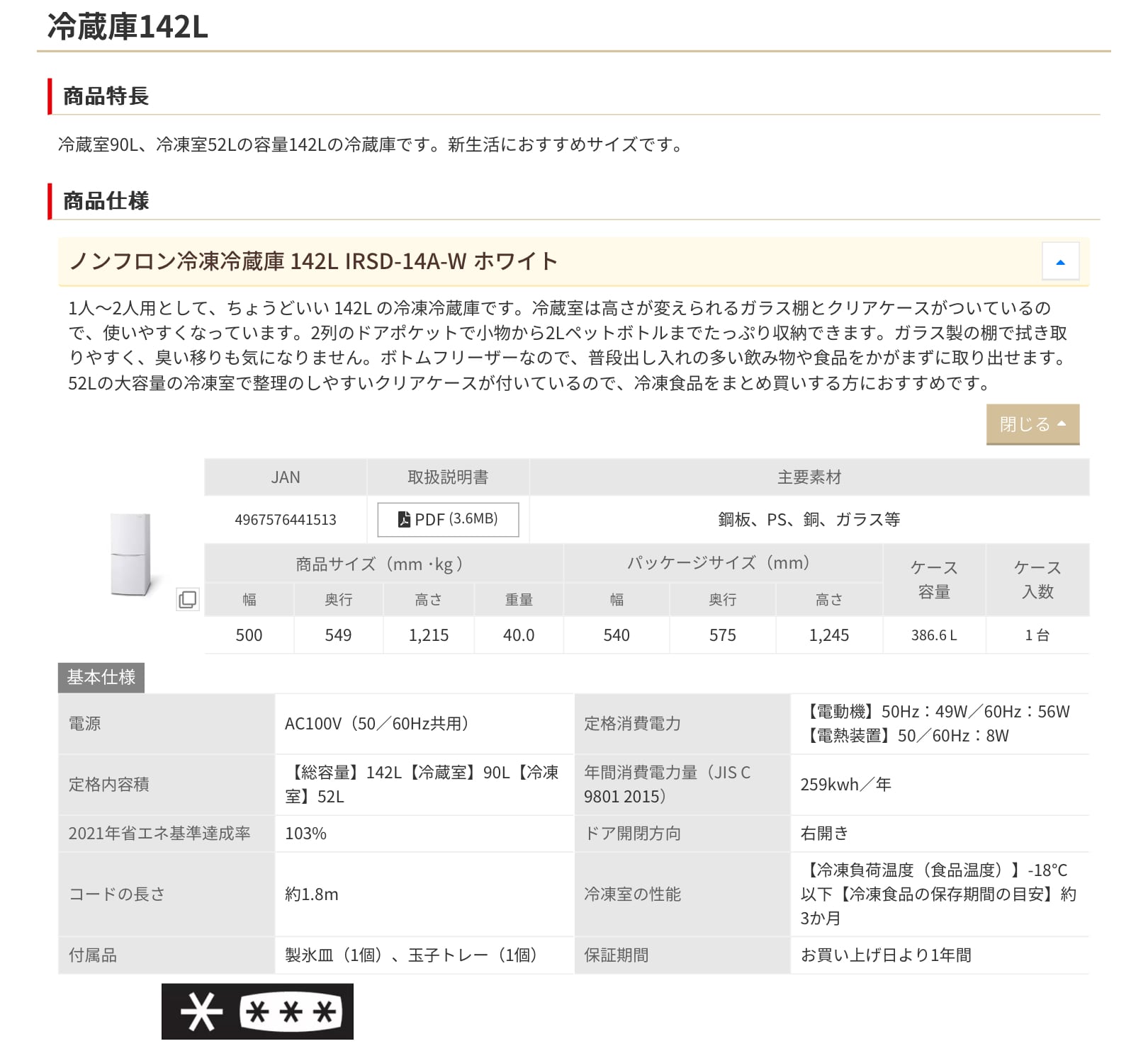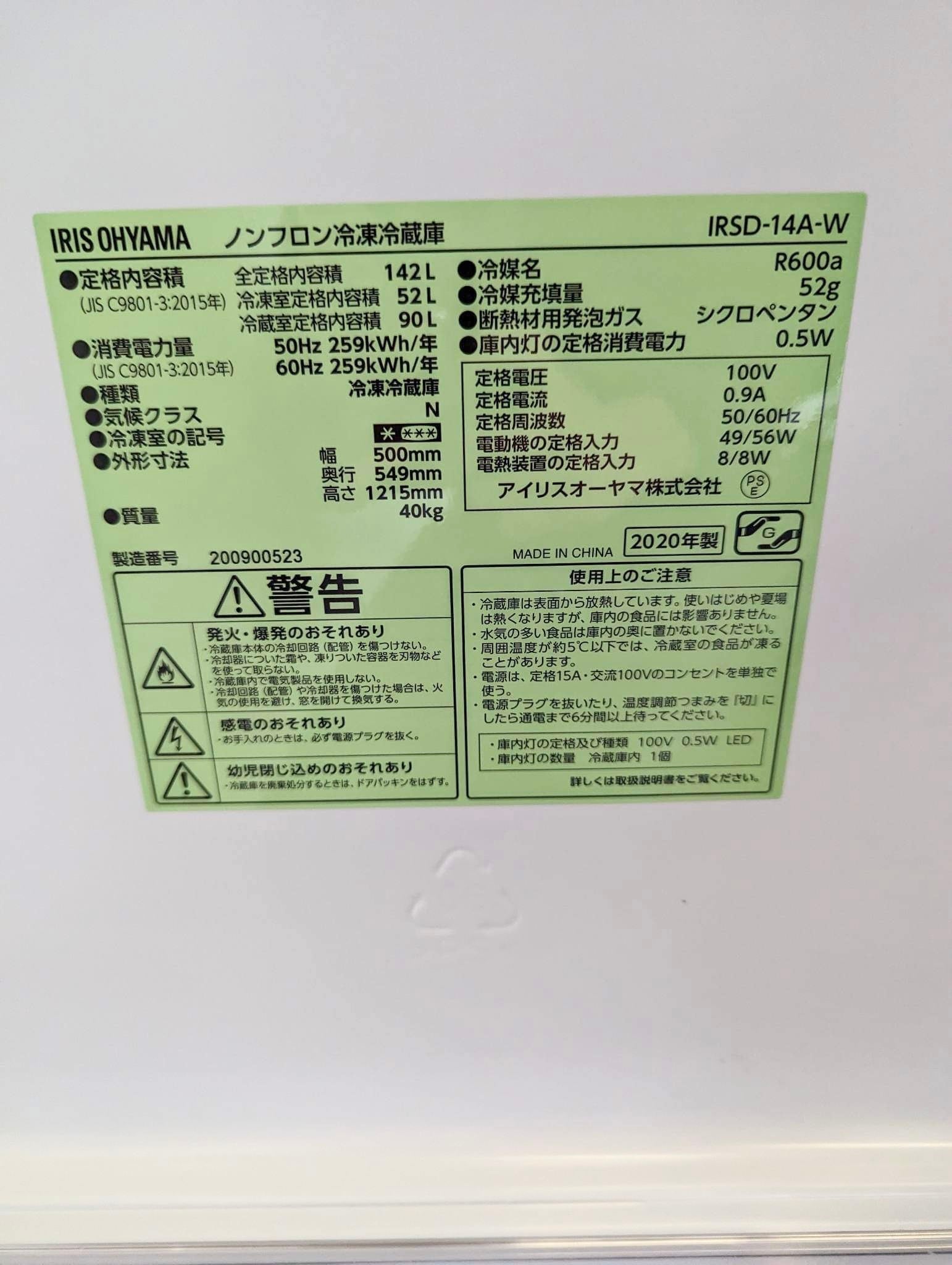 2020年製 IRIS 142L ノンフロン冷凍冷蔵庫
