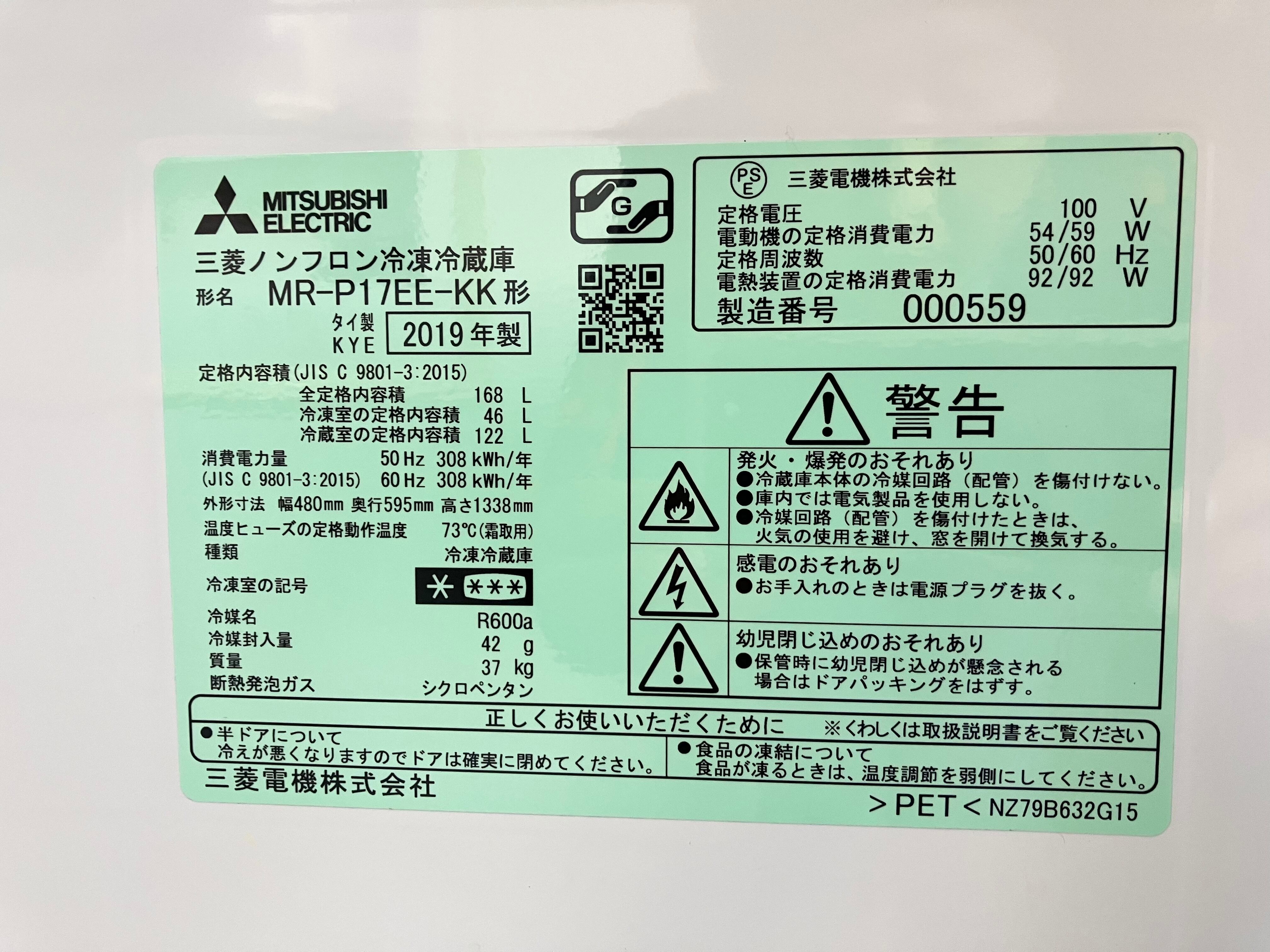 2019年製 MITSUBISHI 168L ノンフロン冷凍冷蔵庫