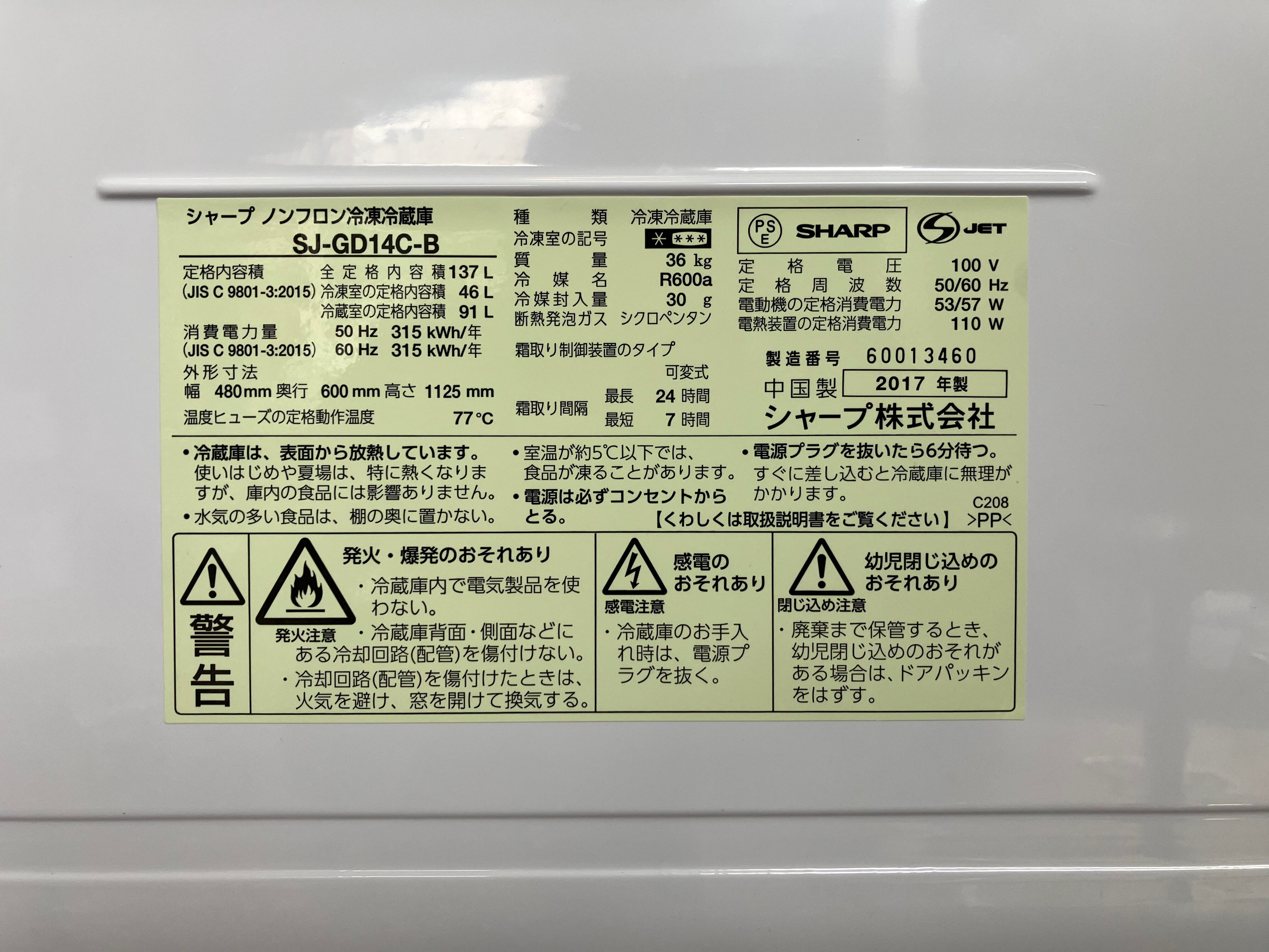 137L SHARP ノンフロン冷凍冷蔵庫 2017年製