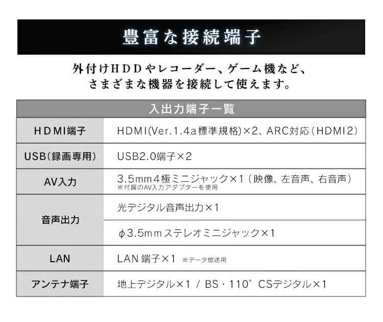 本体、リモコン、miniB-CASカード、アンテナコード、電源コード