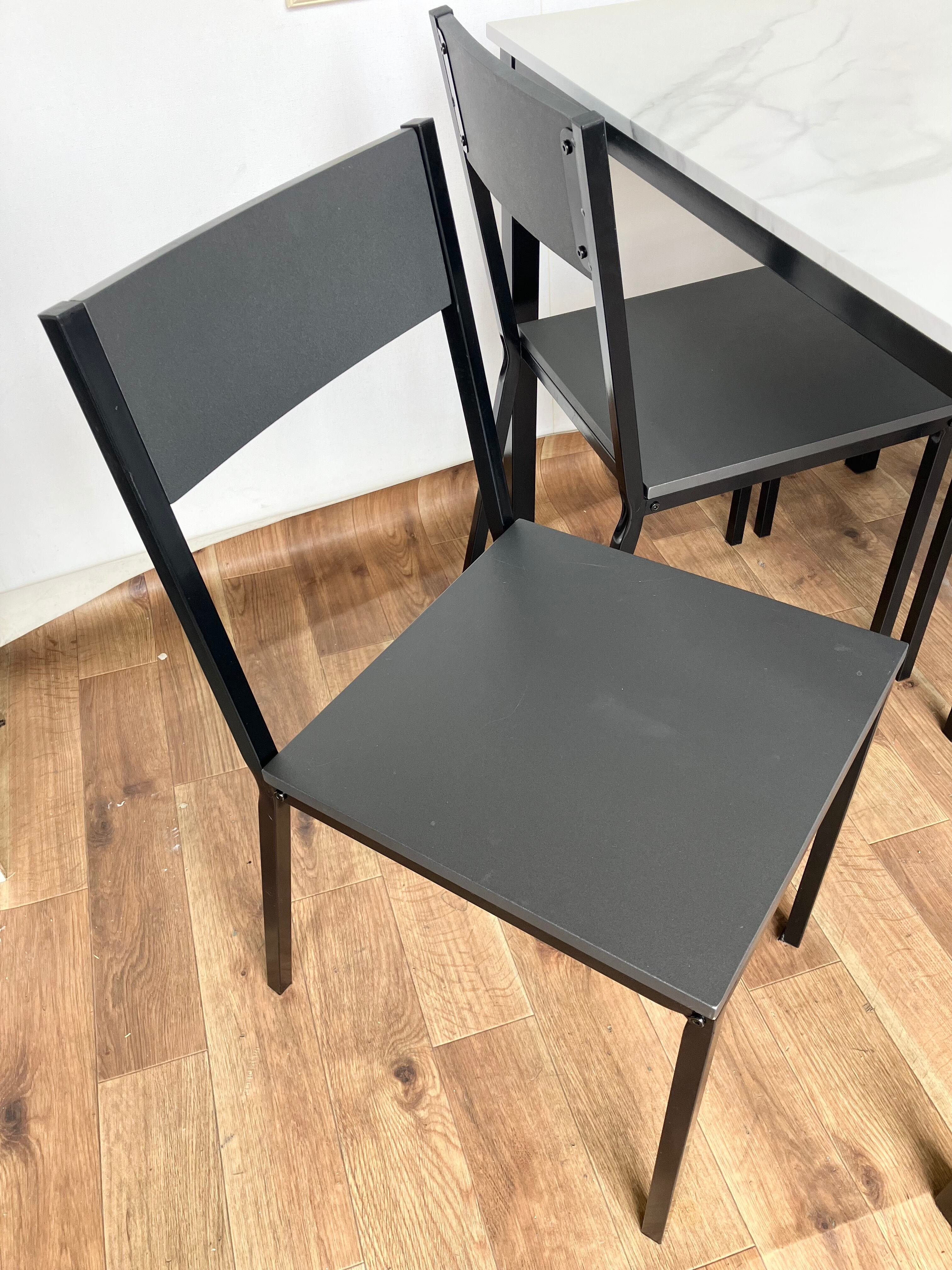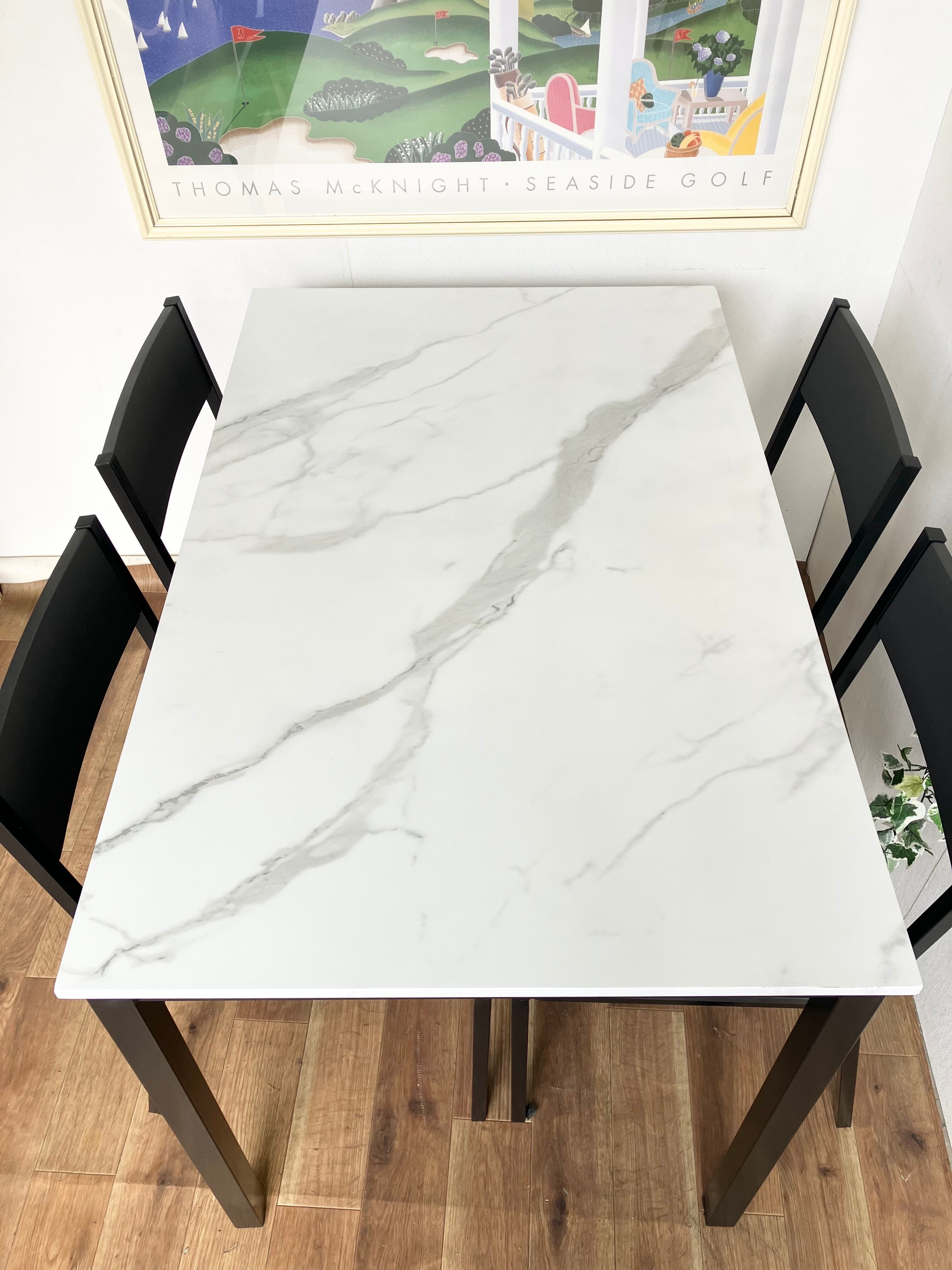 大理石柄の天板にマットなスチール脚のダイニングテーブルとそれに合わせてイス4脚の5点セットです☆